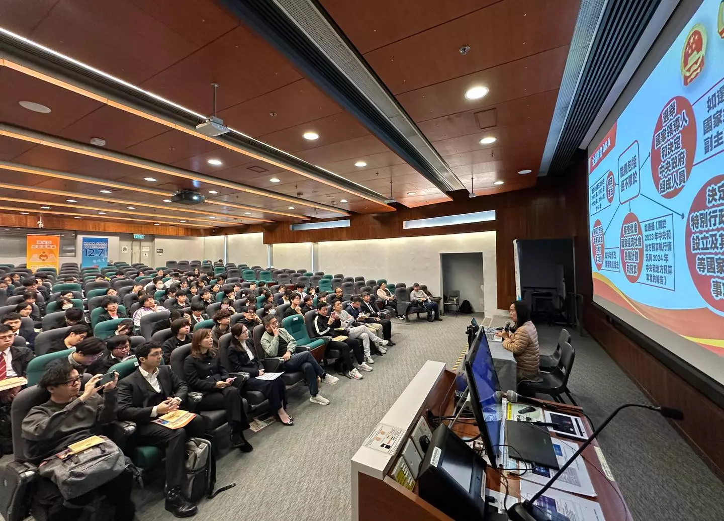 全國人大代表凌友詩向過百名油尖旺區大專生及高中生主講 。