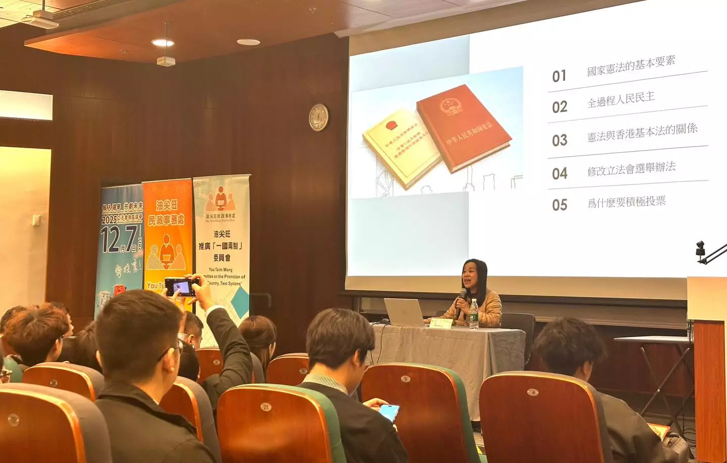 4.月初,油尖旺區青年發展及公民教育委員會轄下推廣「一國兩制」委員會,聯同香港理工大學專業及持續教育學院,喺校內舉辦「國家憲法日油尖旺青年座談會」。