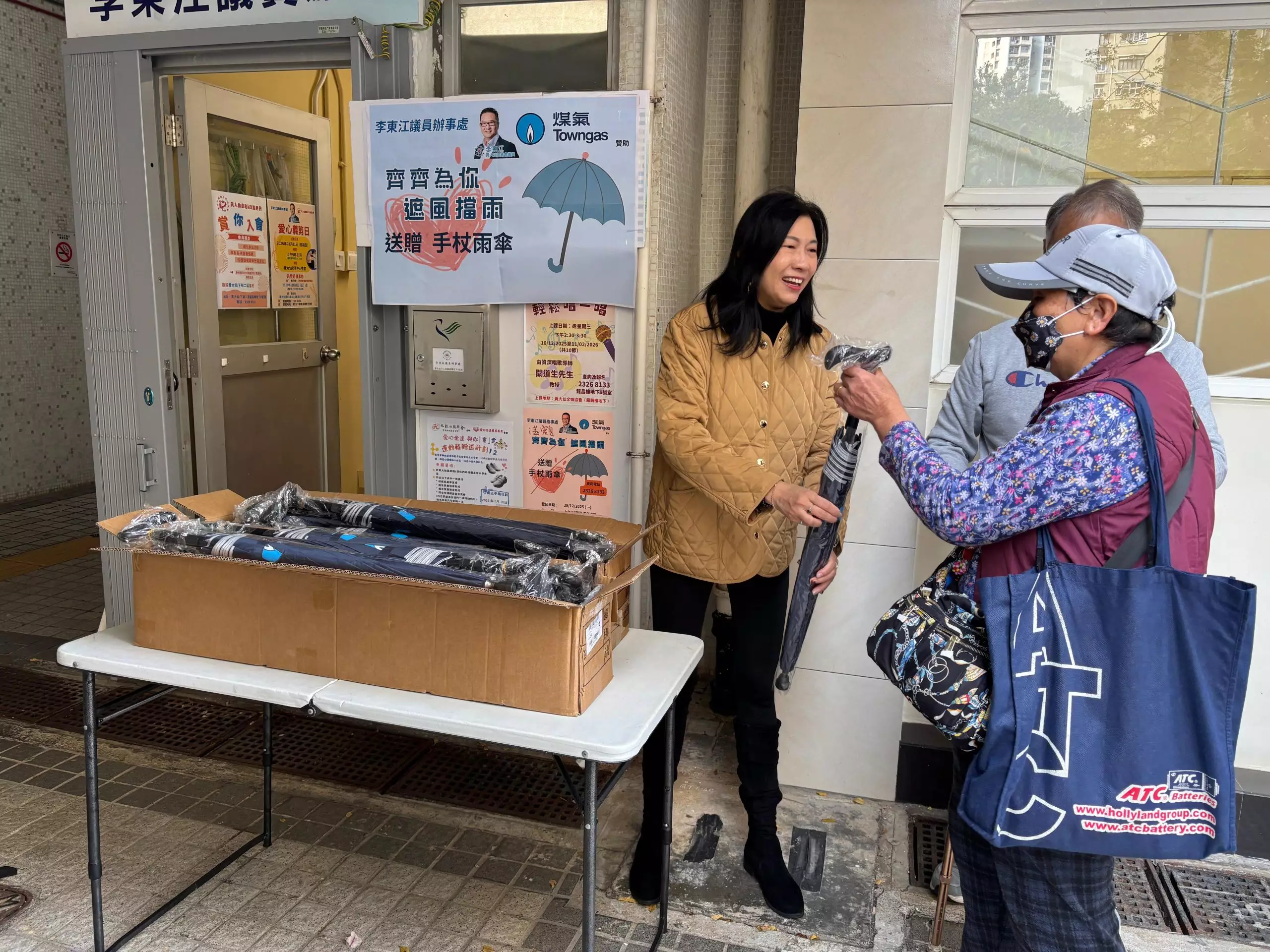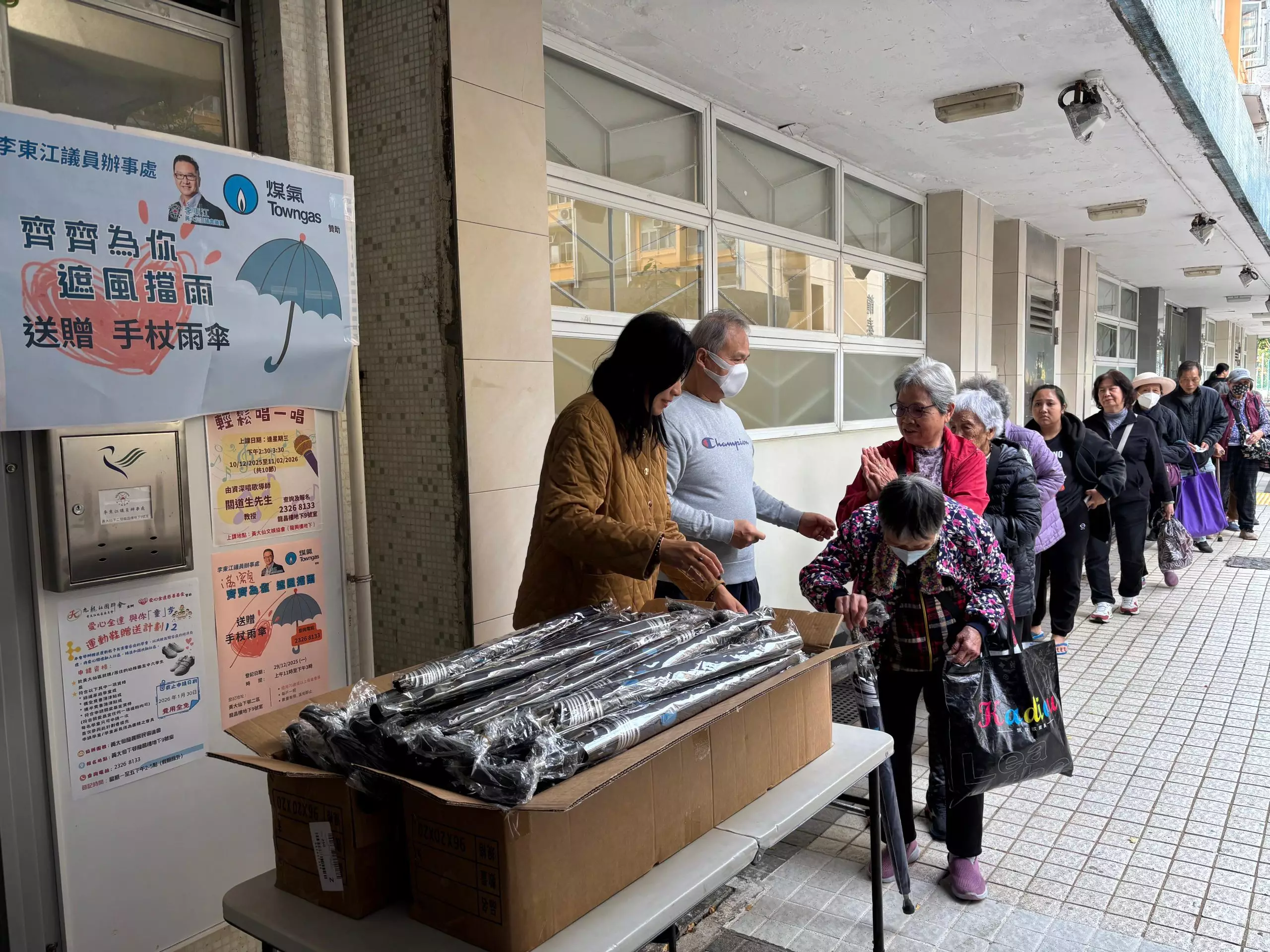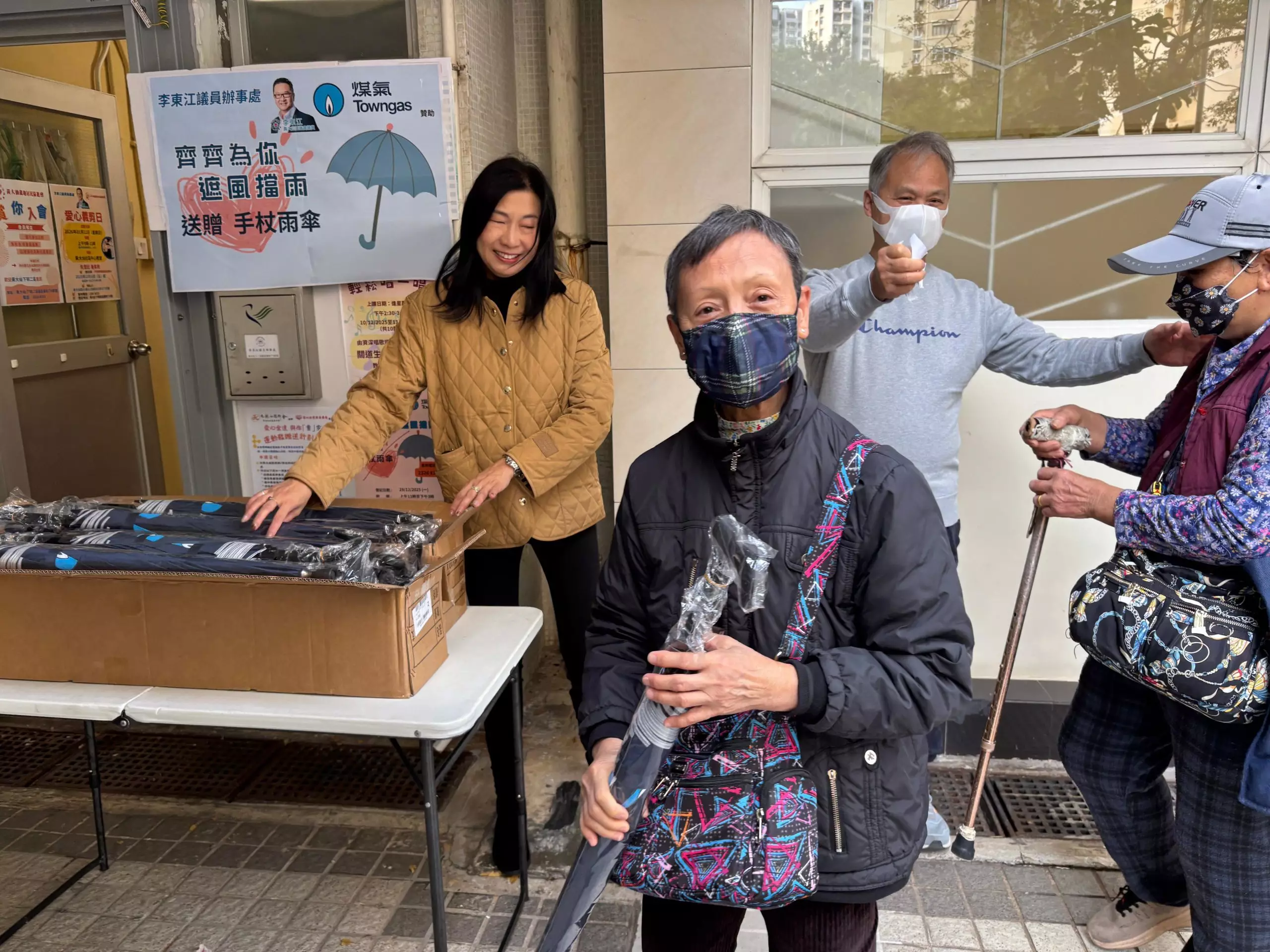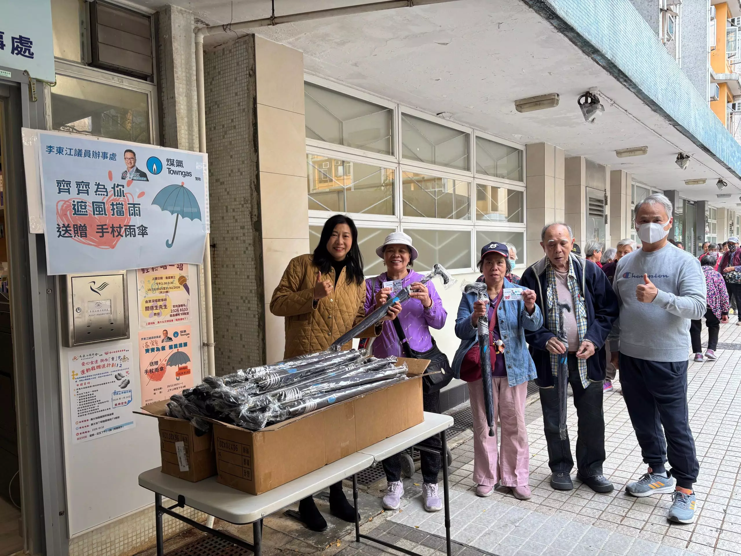 派發長者心心念念嘅煤氣手杖雨傘。