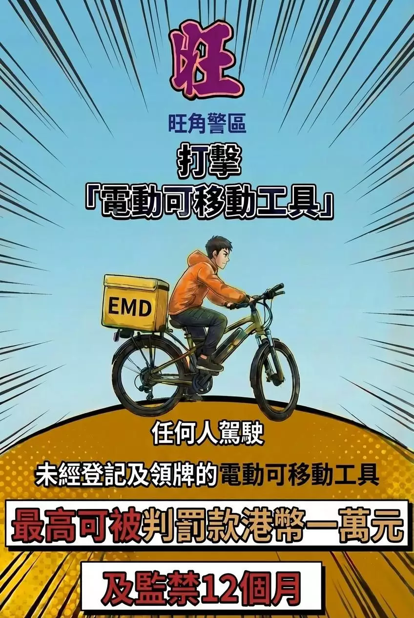 旺角警區人員於前日(1月5日)在快富街/西洋菜南街巡邏期間,發現一名男子在道路上駕駛非法電動可移動工具,於是以涉嫌「駕駛時沒有有效駕駛執照」、「駕駛未有登記車輛」、「沒有第三者保險而使用車輛」及「駕駛時沒有戴上認可防護頭盔」將其拘捕,並扣查涉案一部電動單車。