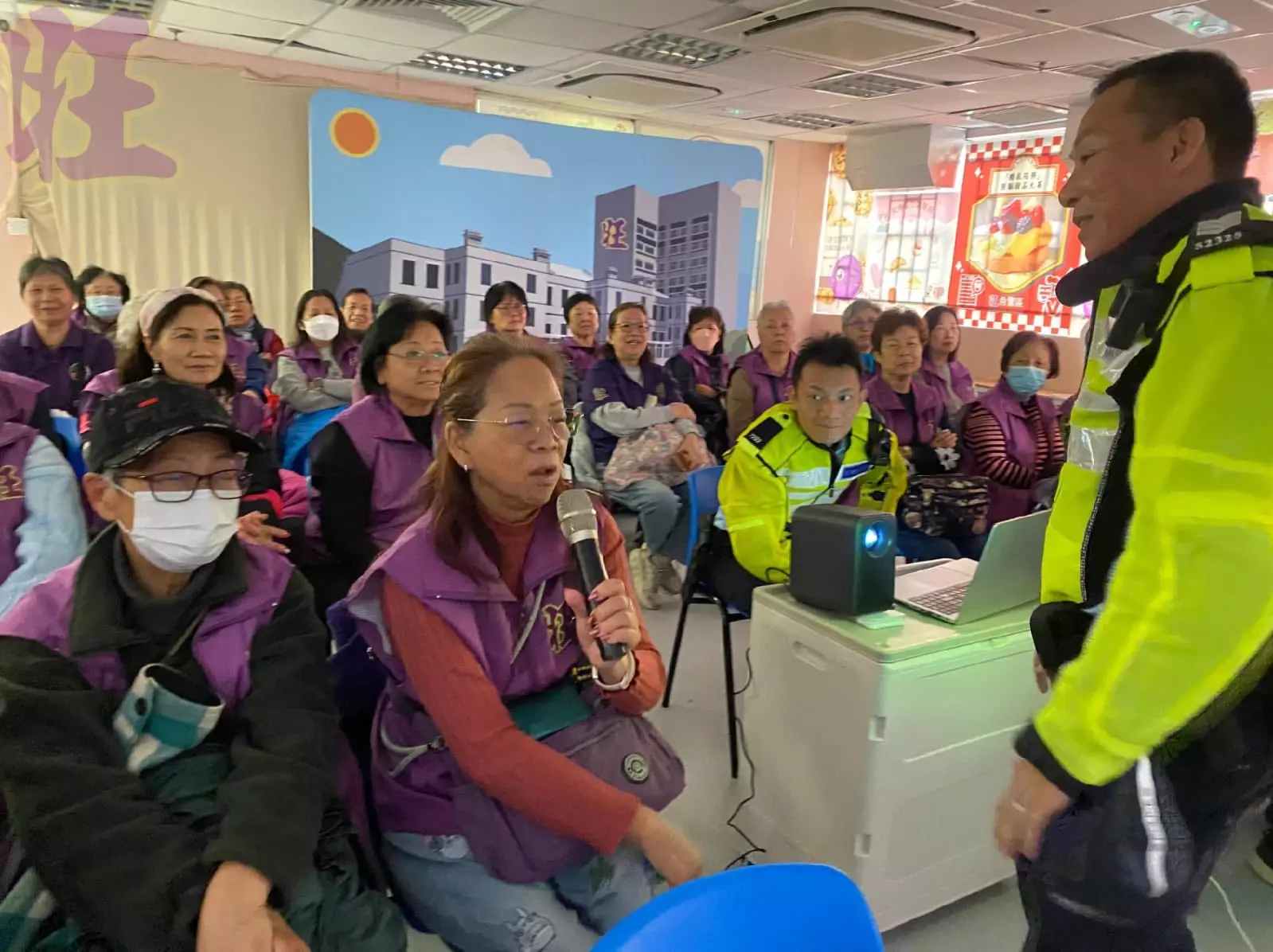交通部道路安全組周警長用心講解道路安全的重要性,特別提醒老友記,橫過馬路務必使用行人天橋、隧道、斑馬線或設有交通信號燈的過路處,以確保安全。任何時候,不應貪一時之便而亂過馬路,尤其要注意大型車輛的盲點,避免發生意外。