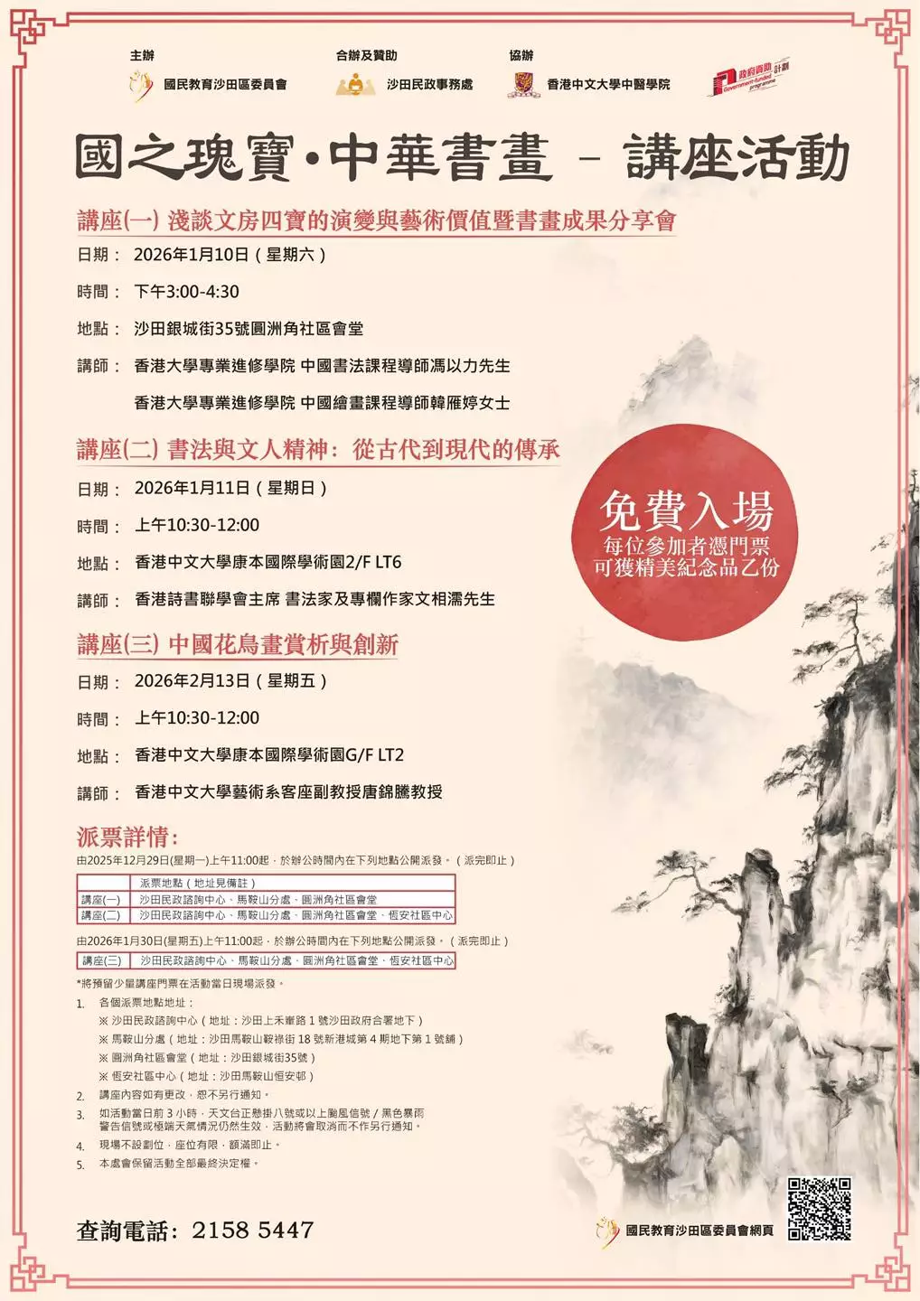 由國民教育沙田區委員會主辦、沙田民政處合辦贊助及香港中文大學中醫學院協辦嘅「國之瑰寶・中華書畫 — 講座活動」首兩場講座已經分別喺10/1及11/1圓滿結束 。