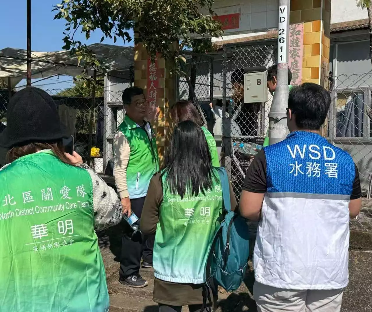此外,民政處還組織區議員,聯合粉嶺區、沙頭角區、打鼓嶺區鄉事委員會,以及7支關愛隊共逾50名隊員,走訪受影響區域及特殊住戶,開展宣傳並派發樽裝水。