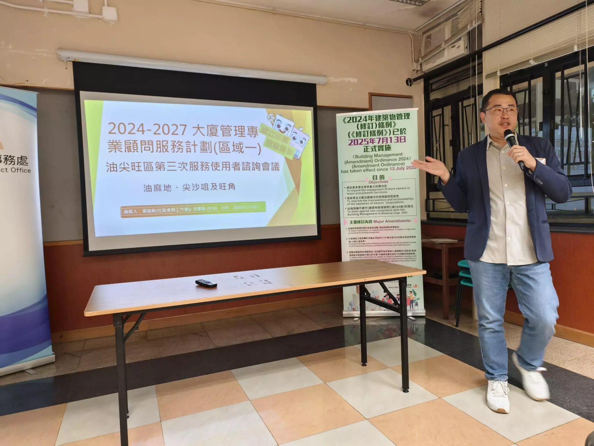 1. 油尖旺民政處尋晚(20/1)舉辦第三次「大廈管理專業顧問服務計劃」(BMPASS)嘅服務使用者諮詢會議,油尖旺民政專員李家維出席並向計劃下成立嘅業主立案法團頒發門牌,以及頒發嘉許狀比居民聯絡大使,感謝佢哋參與大廈管理付出嘅努力。會議仲安排大廈家居保險知識講座,提供實用嘅資訊比出席嘅地區人士/業主,佢哋都肯定計劃嘅成效,及承辦機構及管理公司嘅努力。由計劃開展至今,已協助成立13個法團。