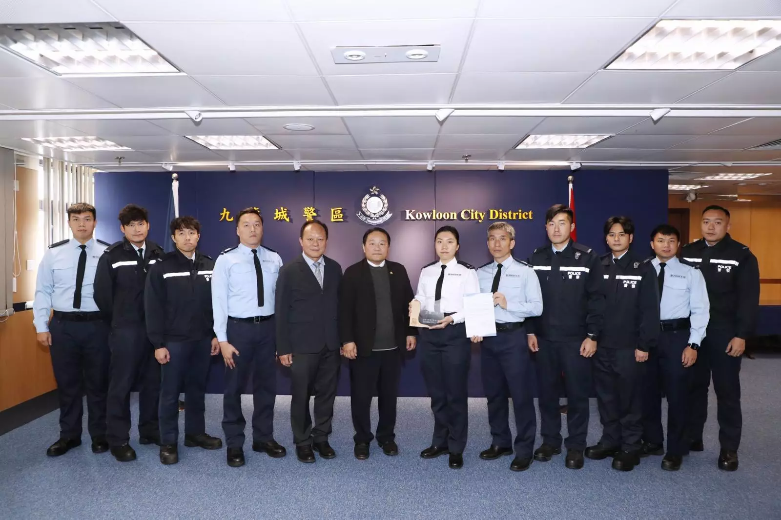 今日(23日),中華基督教會基道中學翁港成校長來到紅磡警署,向紅磡分區特遣隊、紅磡分區軍裝巡邏小隊第一隊頒贈紀念牌及感謝信,以感謝警方就一宗猥褻性暴露身體的案件,行動迅速並且逮捕疑犯,高度展現出警隊的專業。