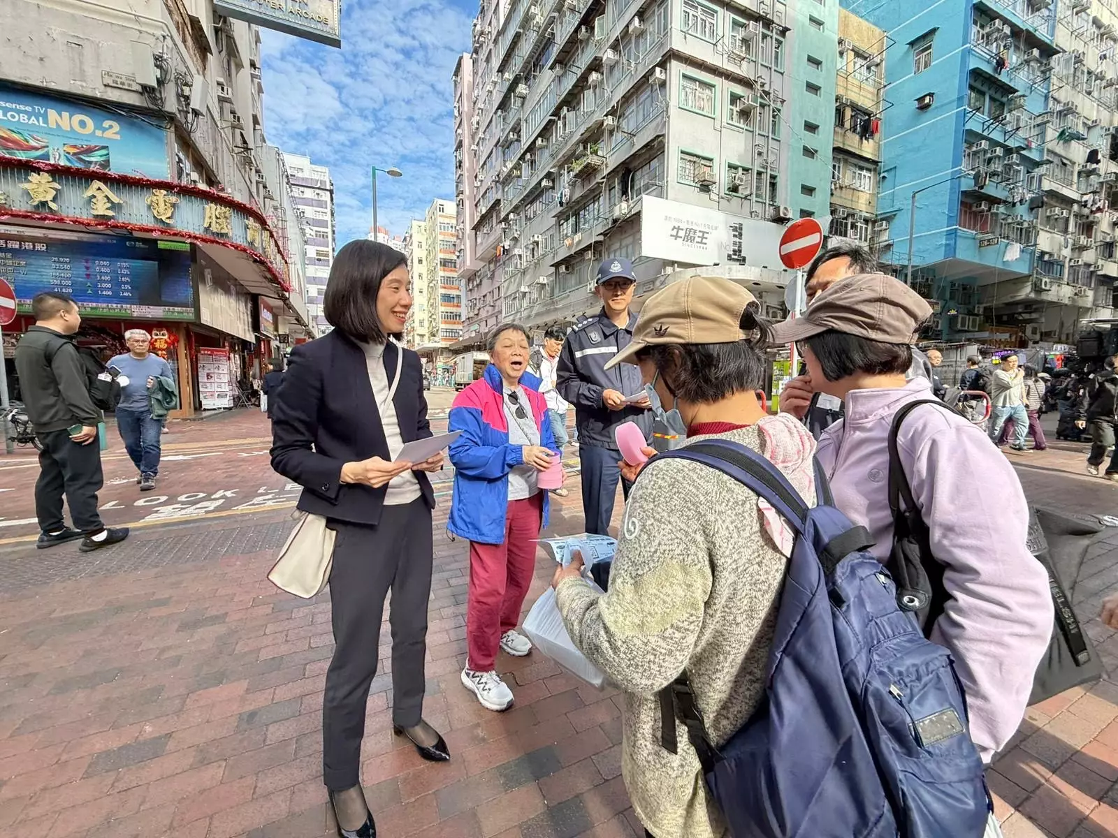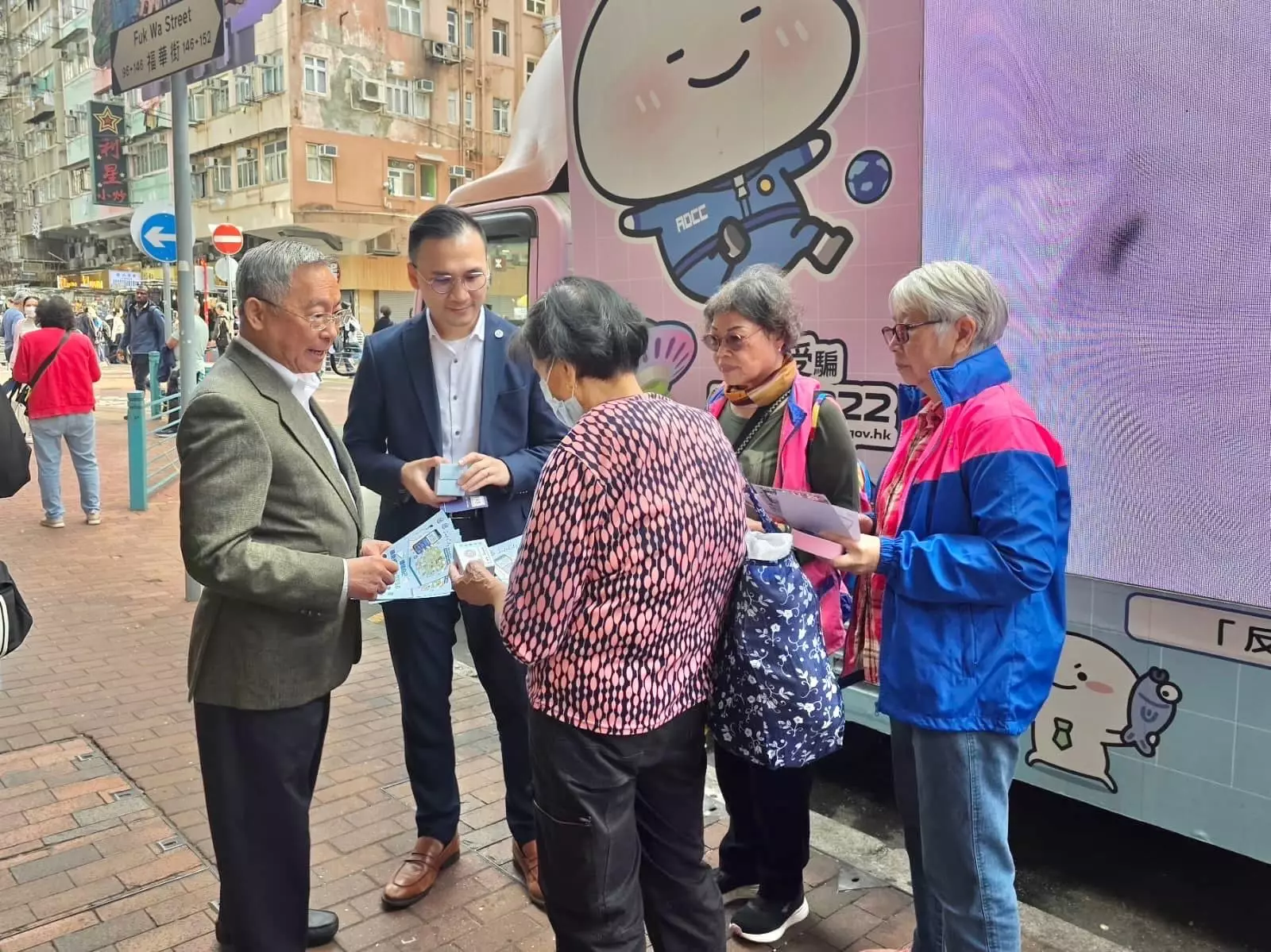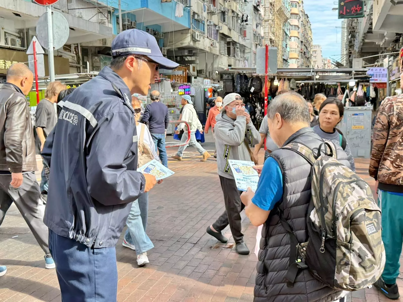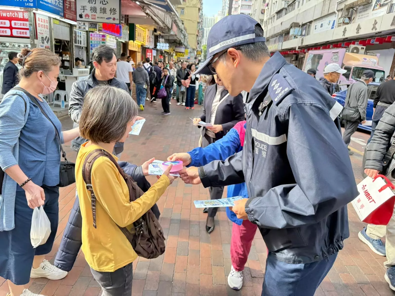 今日(26日),深水埗警區聯同深水埗區撲滅罪行委員會盧永文主席BBS JP、鍾婧薇委員MH、防止罪案科人員及深水埗區耆樂警訊老友記及「防罪宣傳車」,於深水埗黃金商場外進行防罪宣傳,提醒大家年近歲晚,加強防罪意識,小心保管財物。