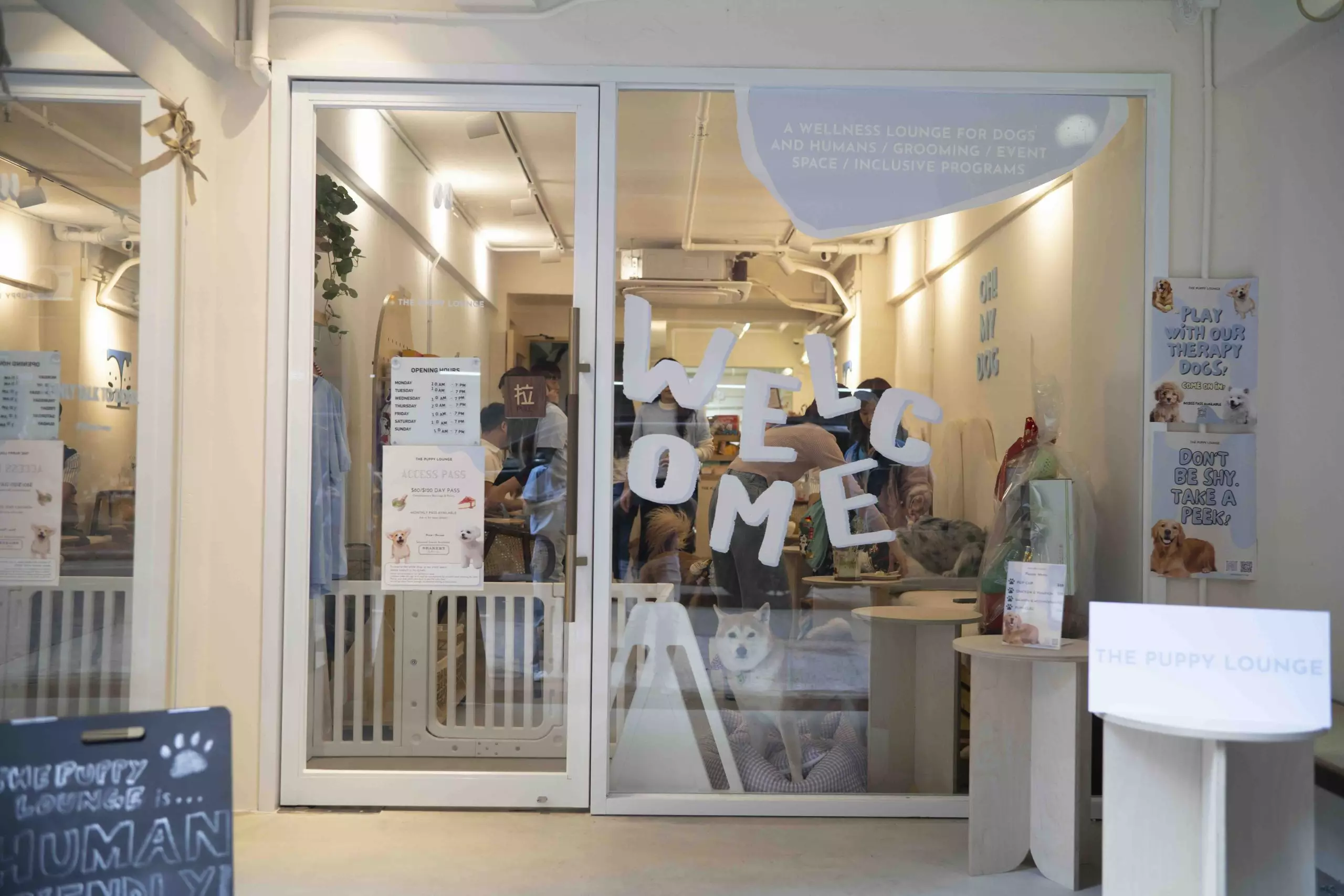 「The Puppy Lounge」坐落於上環皇后大道西,兩層式的設計巧妙地結合了寵物美容、狗狗幼稚園及訓練課程,以及為主人和寵物提供的休憩放鬆區。地面層是療癒交誼與精神健康空間,是一個歡迎所有人與愛犬到訪的犬隻友好空間,無需預約,歡迎隨興到訪。無論您是想帶著愛犬找個地方放鬆、辦公,還是單純想與駐場治療犬互動以紓解壓力,同樣適合。這裡更供應免費飲品與烘焙糕點,讓到訪者在狗狗的陪伴下享受悠閒時光。此外,店內設有專業的寵物自助沖涼設施,讓飼主能親自為愛犬清潔,增進感情。