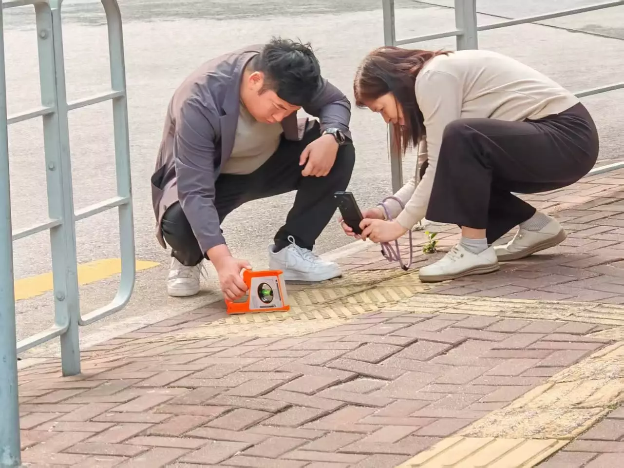 接到反映後,黃啟進與林婉濱攜帶斜度尺到現場展開實地檢查,發現該處路面存在明顯凹凸不平問題,且從路面凸起位置至路口處設有坡度觸覺引路磚,經量度斜度高達10度。對比附近其他路口,坡度均未超過6度,過大的坡度及凹凸路面或為跌倒事故的主要原因。
