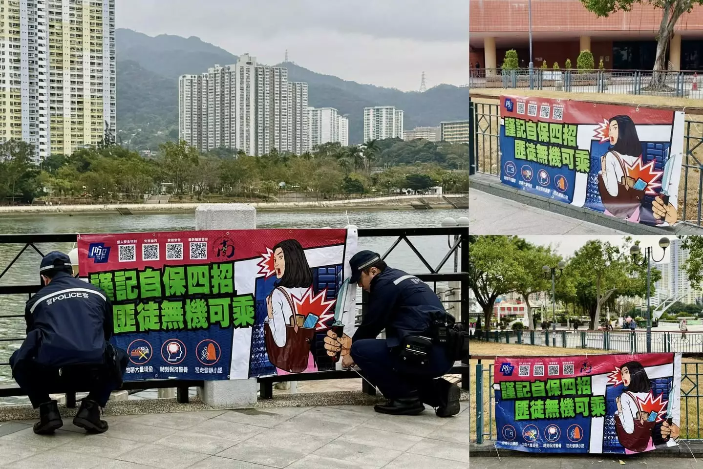 為進一步防患於未然,鄧肇峰與沙田警區人員於今日(1月30日)清晨,在沙田公園及鄰近城門河畔的當眼位置,懸掛了寫有「謹記自保四招,匪徒無機可乘」的宣傳橫額,並向在場的晨運人士及途人派發防罪宣傳單張,提醒大家時刻保持警覺。