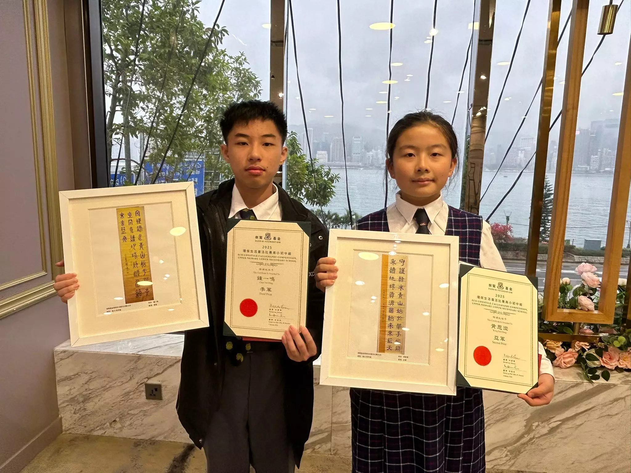 獲得高小初中組書法比賽亞軍的黃思澄和獲得季軍的鍾一鳴是同校同學,他們都有學習書法,在Facebook上留意到樹賢基金的比賽並報名參加,最終脫穎而出。鍾一鳴同學表示,「比賽讓書法的同好們可以互相認識、互相切磋,亦能了解到如何讓生活更加環保,可以學到很多東西。」黃思澄同學也表示,「透過書法來宣揚中國的文化和環保,十分有得著。」