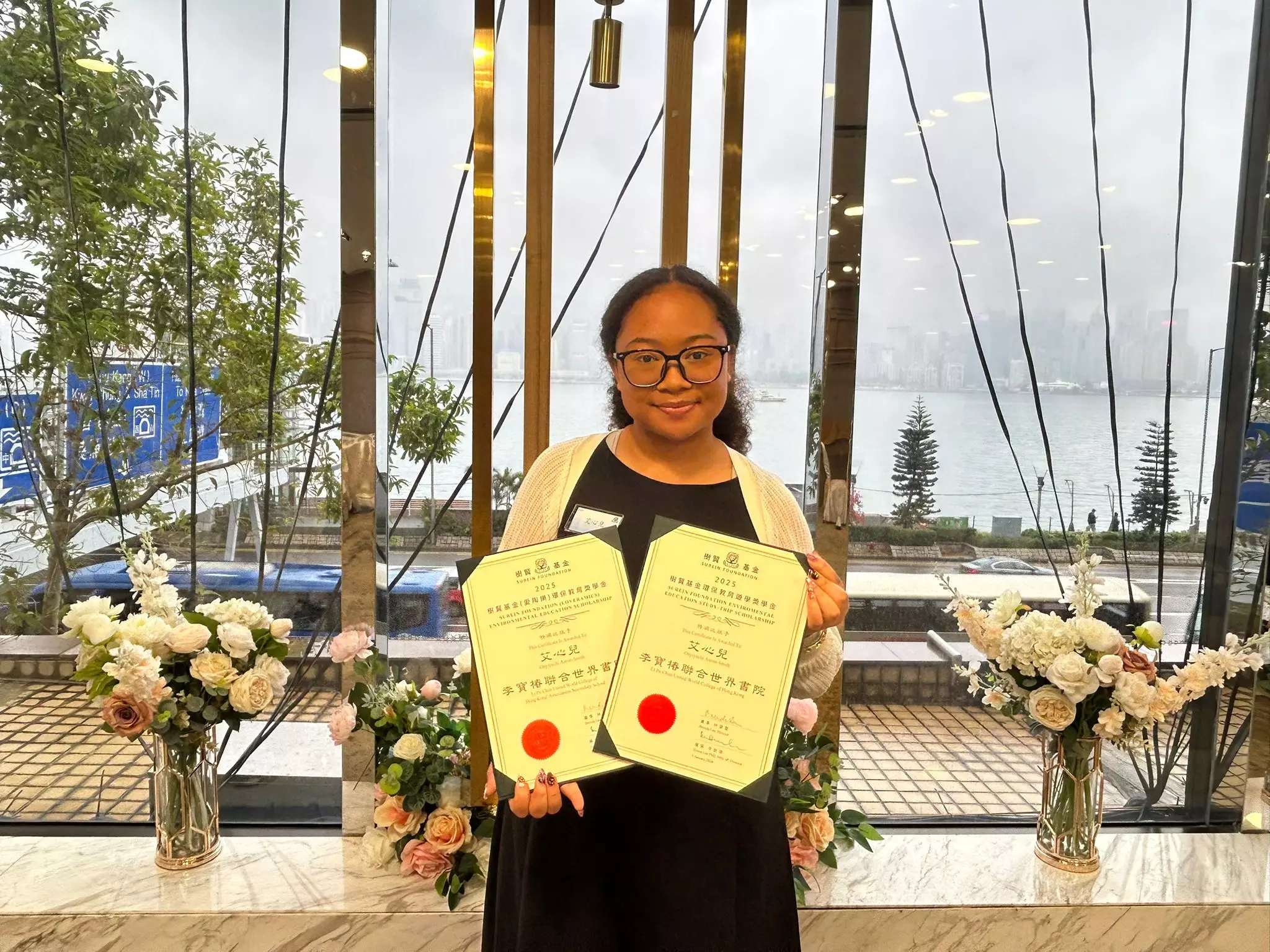 樹賢基金去年設立了10項獎學金,以鼓勵和嘉許積極參與環保活動的同學和研究環保專題的優秀學者,每年獲獎者約100人。同時榮獲兩項獎學金的艾心兒同學(Onyiyechi Aaron-Smith)就讀於李寶椿聯合世界書院,她是一位「小藝術家」,將環保的理念融入自己的興趣之中。她留意到,現在有很多化學工藝的衣服不環保且容易洗爛,「我們很多事情都是為了方便而做,但是現在的方便可能未來會令我們更加不方便,導致破壞地球和氣候。」喜歡服裝設計的她專門到台灣學習傳統文化中的原生態「藍染」工藝,代替化學染料。並融入「輪迴」和「波浪」等元素的設計,令服裝可以兼顧環保和設計感。