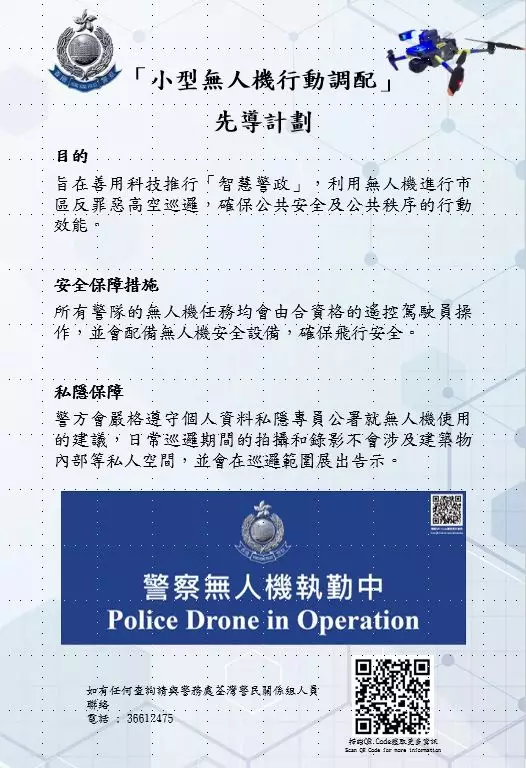 是次計劃旨在透過無人機進行高空監察,更靈活及高效地調配前線警力,進一步預防及打擊罪案,為市民提供更優質的警政服務。