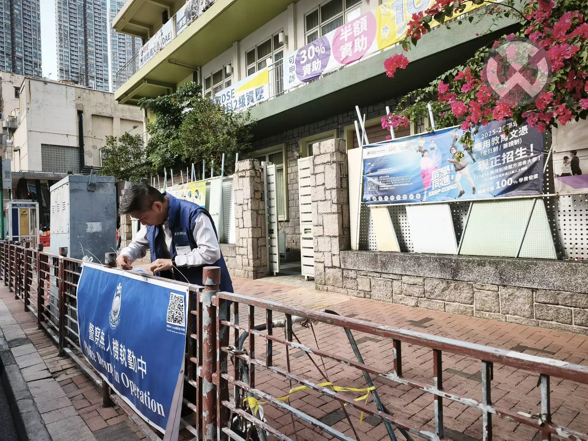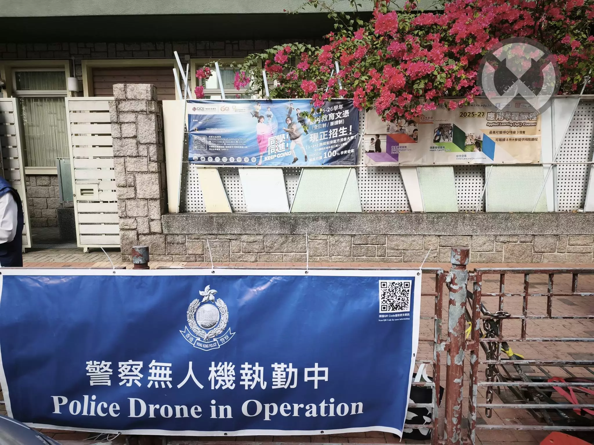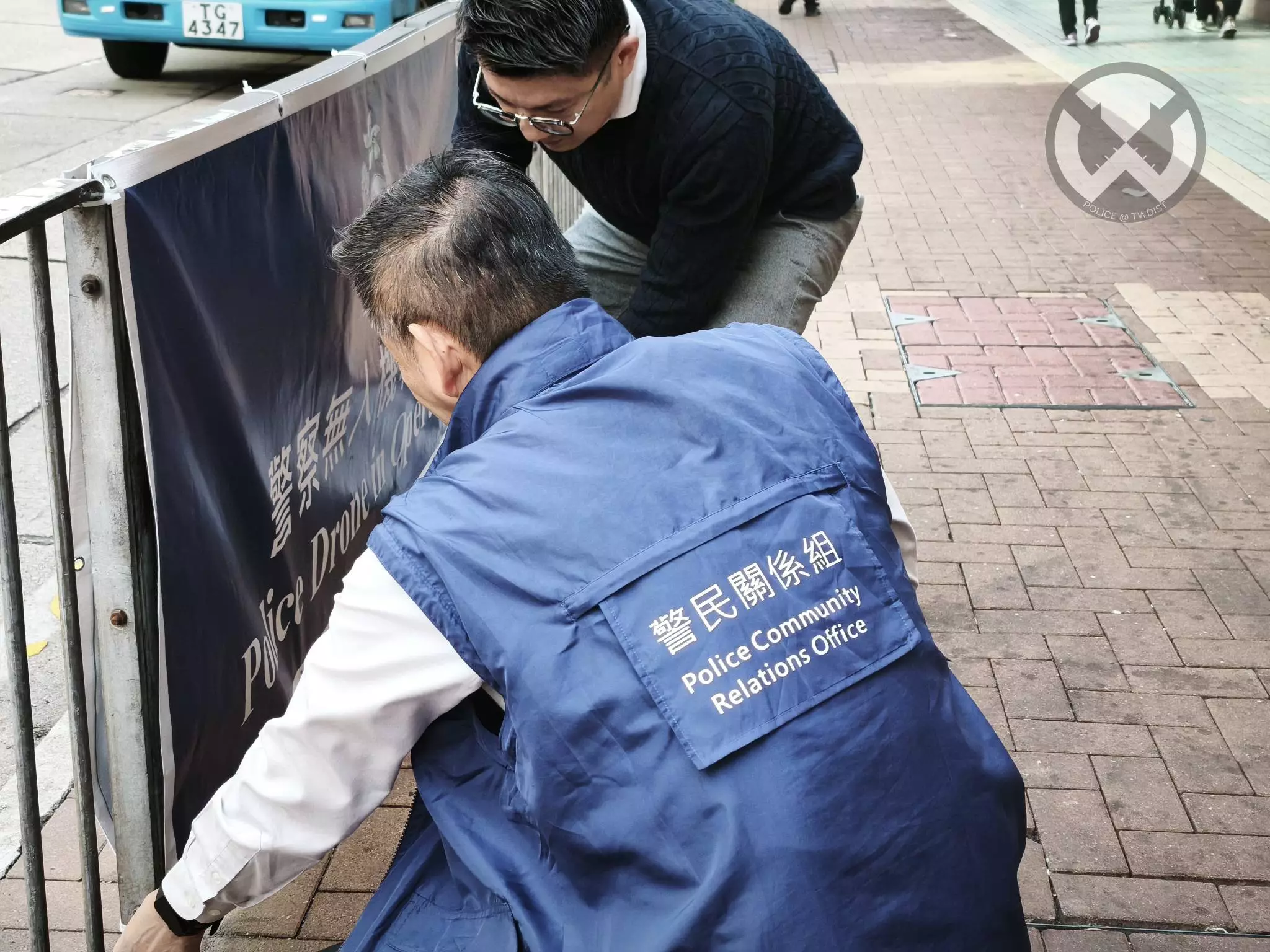 今日荃灣警區警民關係組人員到荃灣市中心一帶懸掛宣傳無人機巡邏橫額,及派發宣傳單張,向市民介紹此項以科技輔助巡邏的行動,加強公眾對警務創新措施的認識與支持。