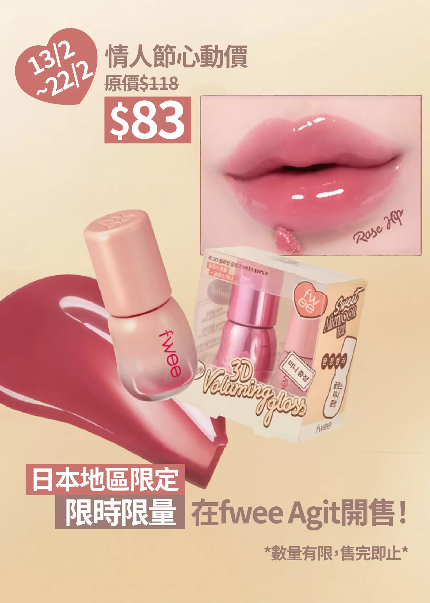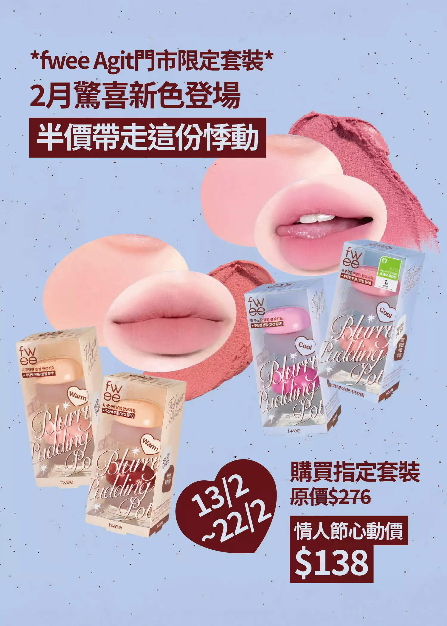 在農曆新年與情人節的雙重甜蜜氛圍來襲,「fwee Agit 」香港專門店更特別呈獻「節日多重賞」,涵蓋新品半價優惠、人氣唇妝產品買一送一、網絡爆紅妝前底霜75折等多重重磅福利,讓你以最實惠價格購入心動妝品,輕鬆打造甜美迷人節日妝容,盡情迎接充滿愛意與喜慶的浪漫季節!