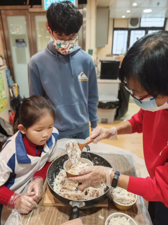 賀年蘿蔔糕以當造的鮮蘿蔔絲,搭配臘味和米粉漿蒸製而成。會員在導師指導下,每位會員都成功製作出屬於自己的蘿蔔糕,並帶回家與家人分享,傳遞團圓溫暖。