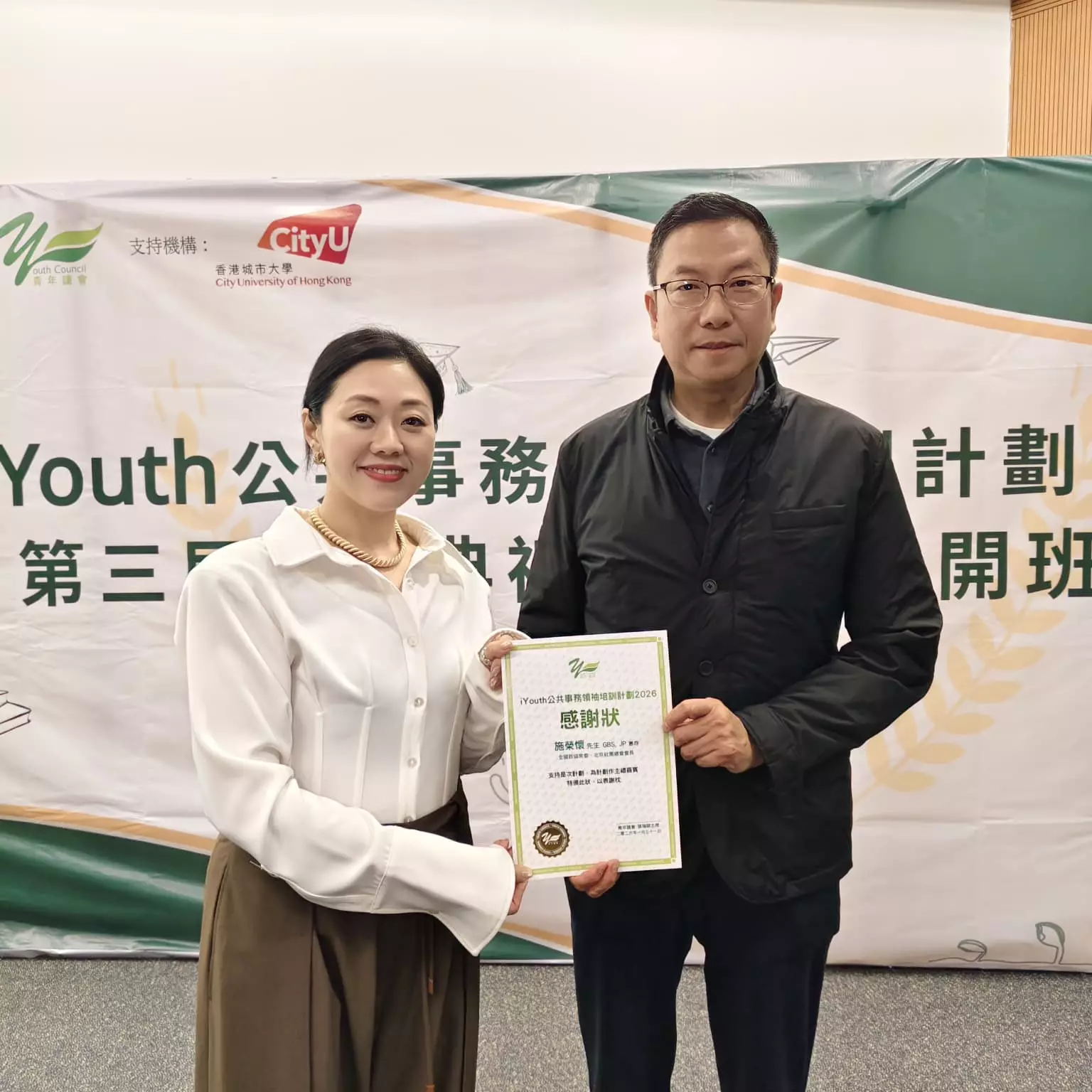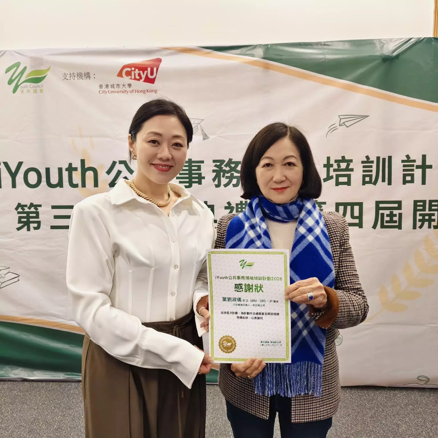 青年議會於2026年1月31日假香港城市大學舉行「iYouth 公共事務領袖培訓計劃 」第三屆結業典禮暨第四屆開班典禮。行政會議召集人及新民黨主席葉劉淑儀女士, 大紫荊勳賢, GBS, JP 和全國政協常委及香港北京社團總會會長施榮懷先生, GBS, JP為儀式主禮。嘉賓包括香港城市大學協理學務副校長張澤松教授和立法會議員暨青年議會副主席黃永威先生。