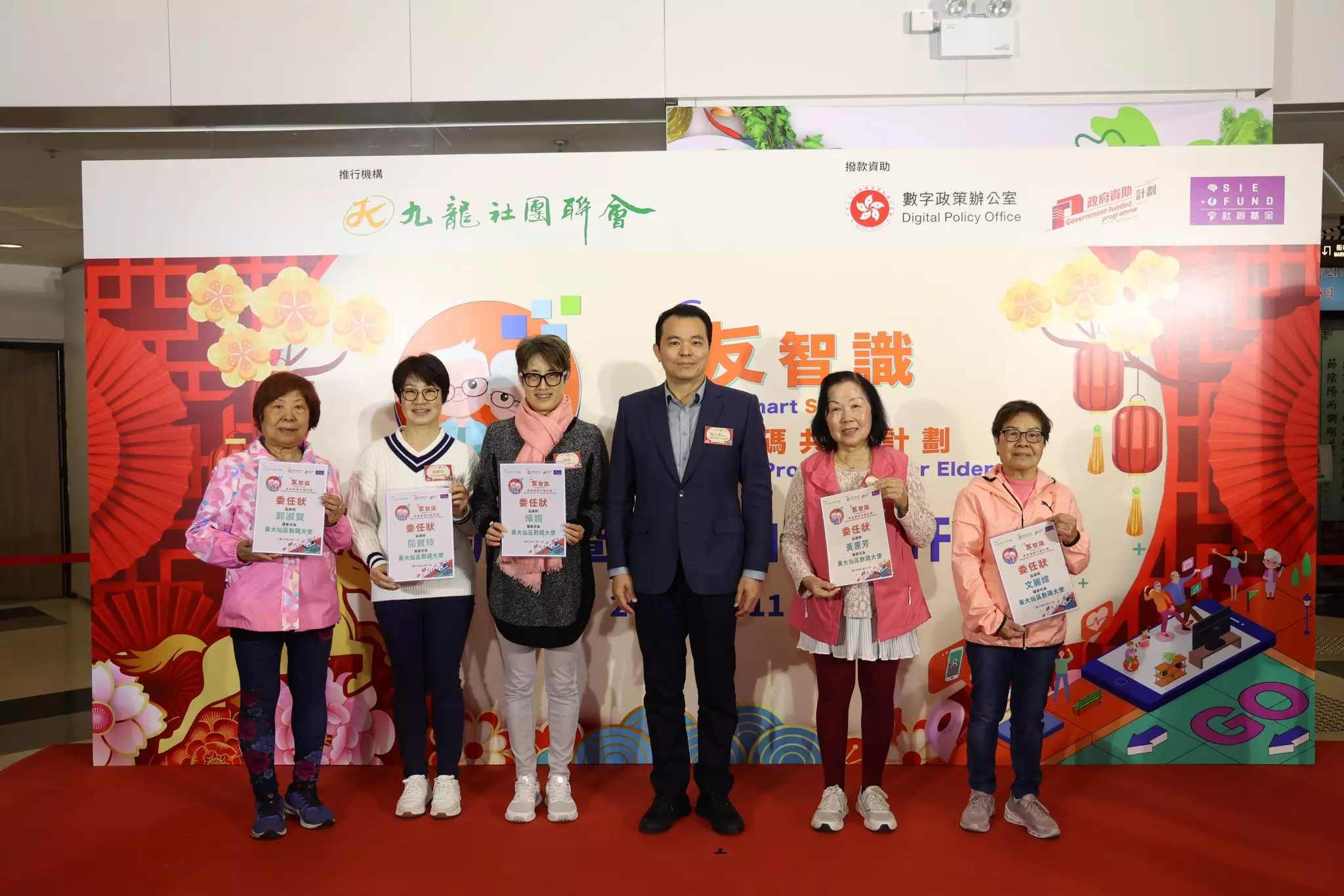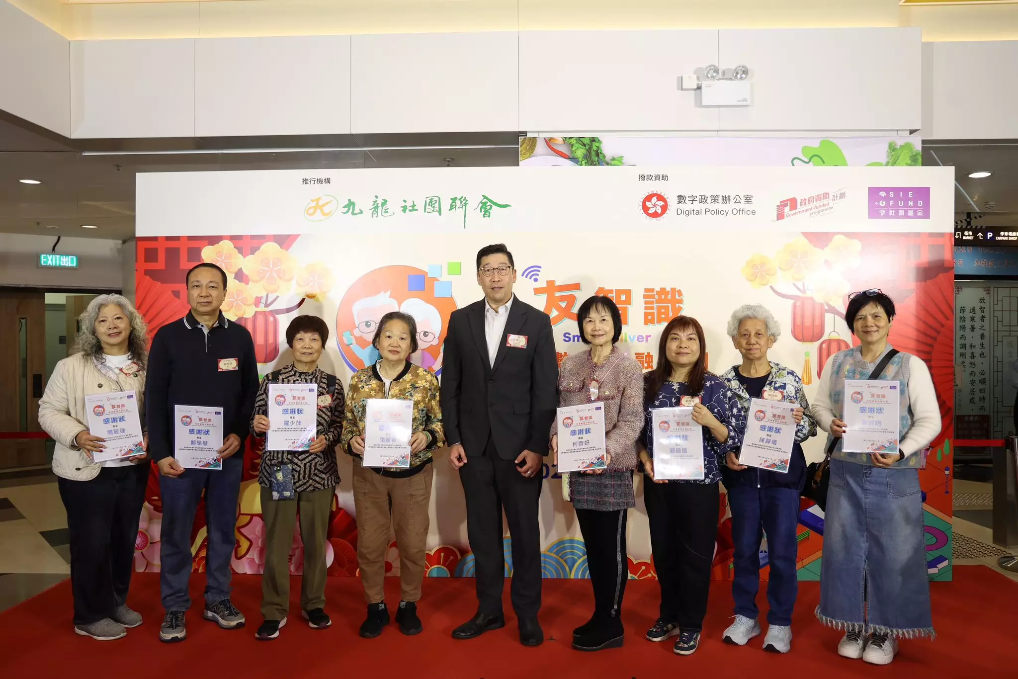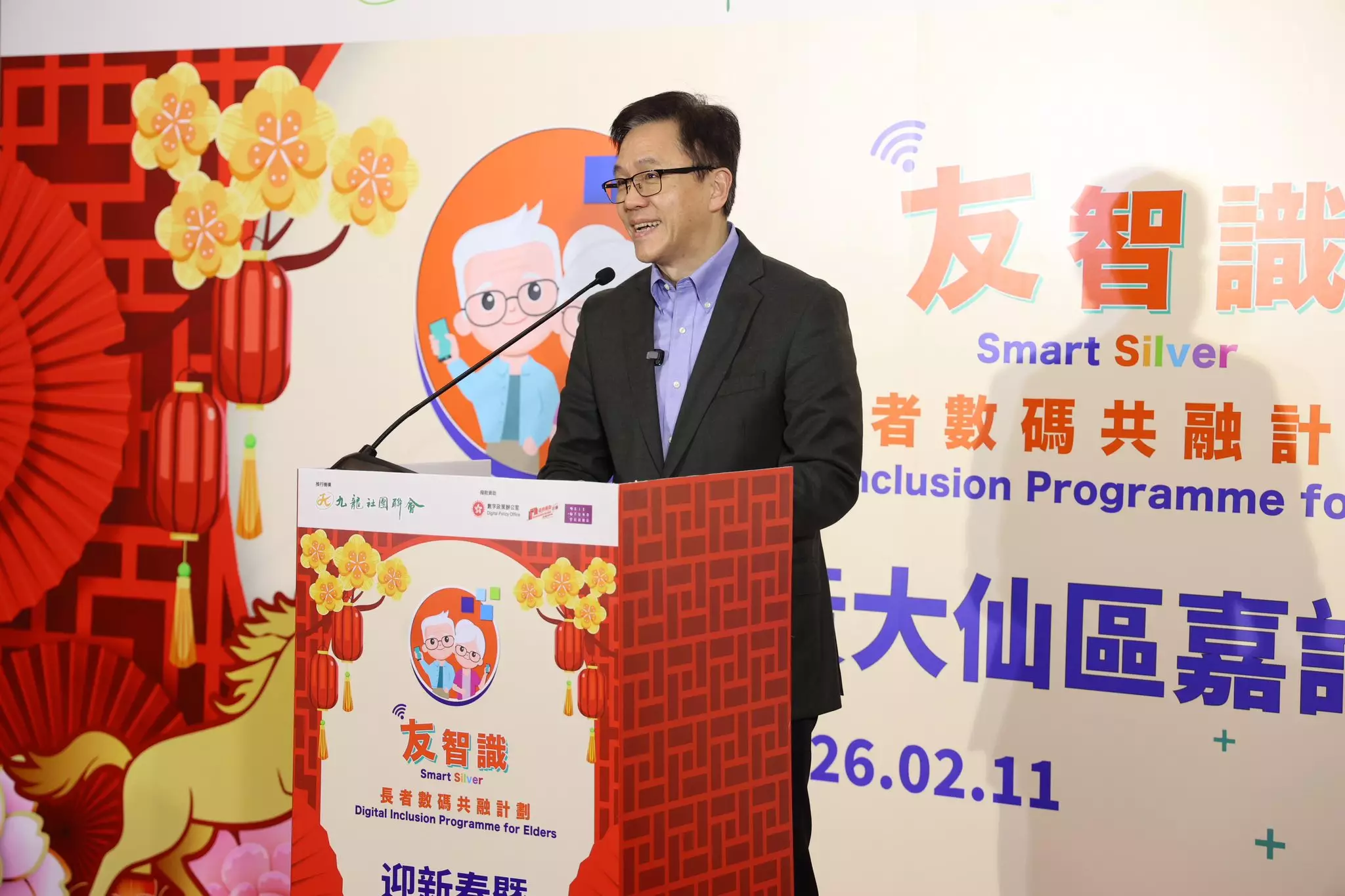 創新科技及工業局局長孫東今日出席九龍社團聯會「友智識」長者數碼共融計劃迎新春暨黃大仙區嘉許禮。孫東與中聯辦九龍工作部部長祝小東、九龍社團聯會理事長徐莉、署理數字政策專員張宜偉及署理副數字政策專員(數字政府)羅荔丹出席活動。孫東先到訪聯會設於啟鑽商場的「友智識」社區支援點,了解日常運作情況和課程內容。孫局長亦與現場參與「友智識」培訓的老友記交流,細心關心他們的學習情況,並送上賀年福袋,向一眾老友記拜早年。