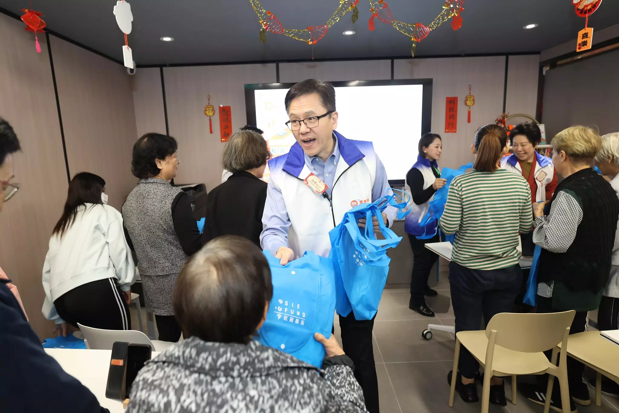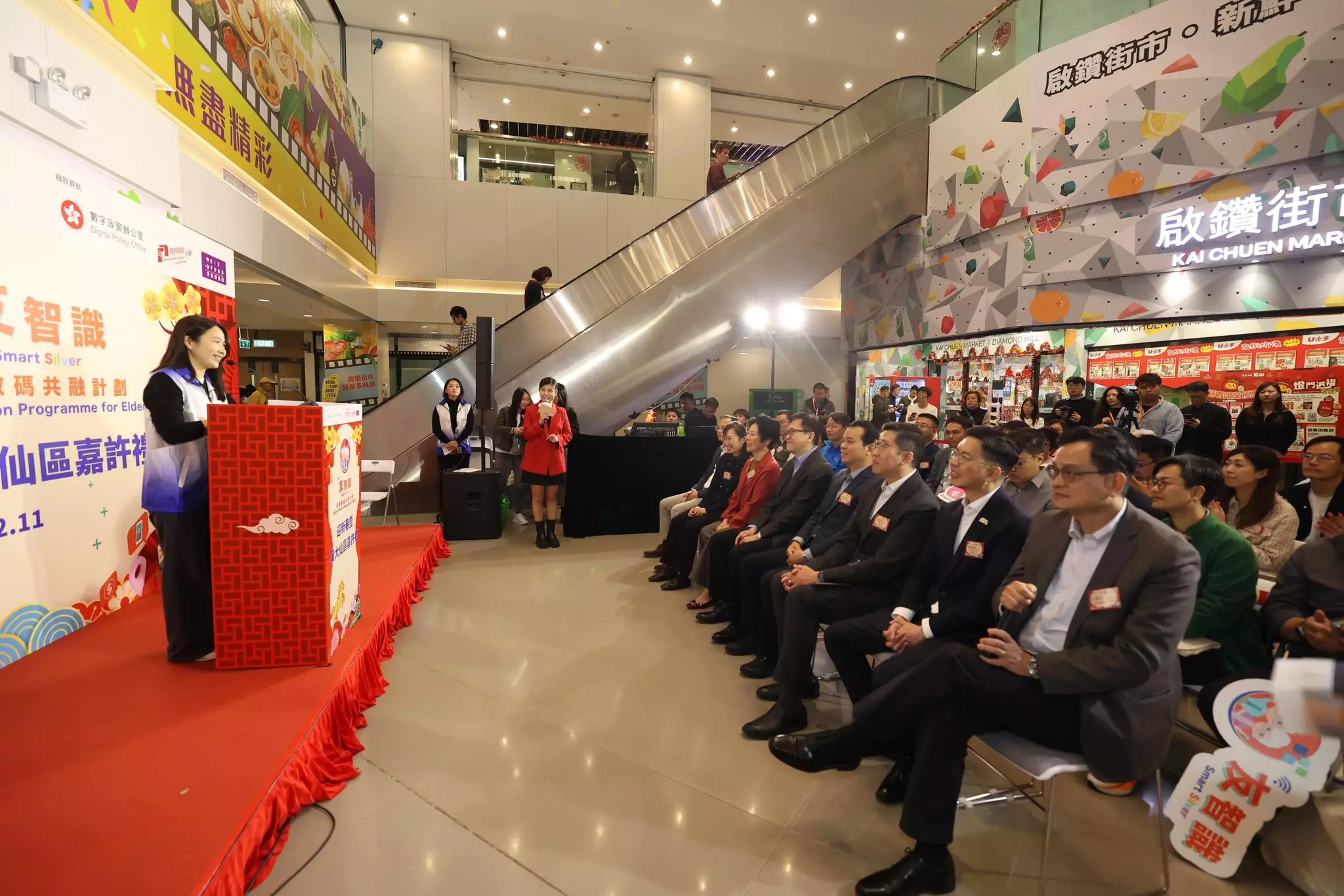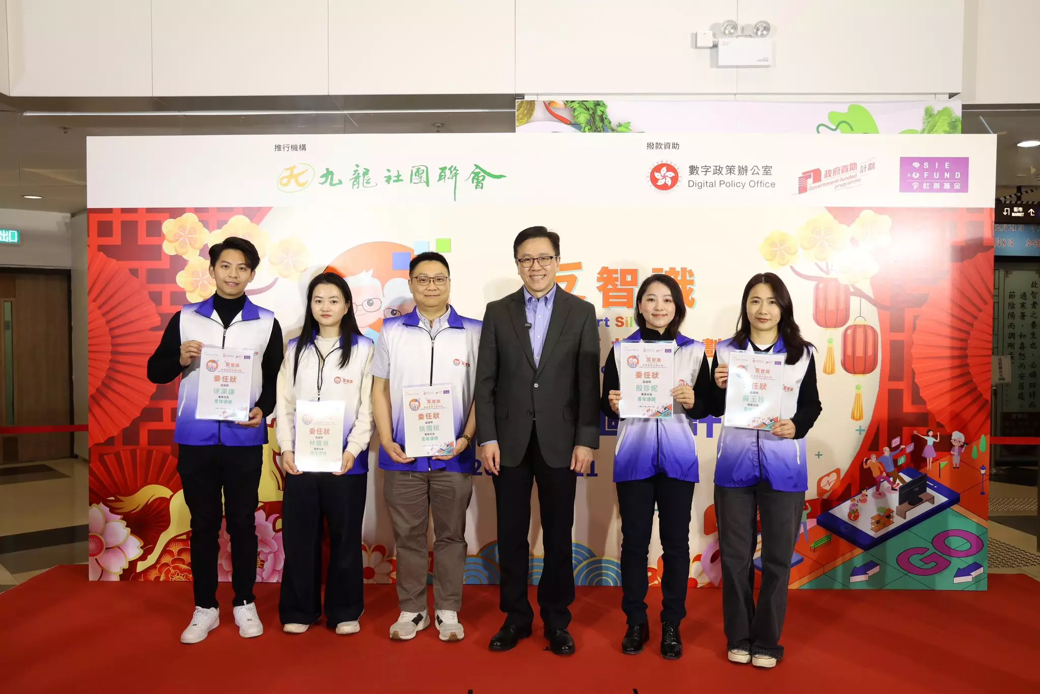 創新科技及工業局局長孫東今日出席九龍社團聯會「友智識」長者數碼共融計劃迎新春暨黃大仙區嘉許禮。孫東與中聯辦九龍工作部部長祝小東、九龍社團聯會理事長徐莉、署理數字政策專員張宜偉及署理副數字政策專員(數字政府)羅荔丹出席活動。孫東先到訪聯會設於啟鑽商場的「友智識」社區支援點,了解日常運作情況和課程內容。孫局長亦與現場參與「友智識」培訓的老友記交流,細心關心他們的學習情況,並送上賀年福袋,向一眾老友記拜早年。
