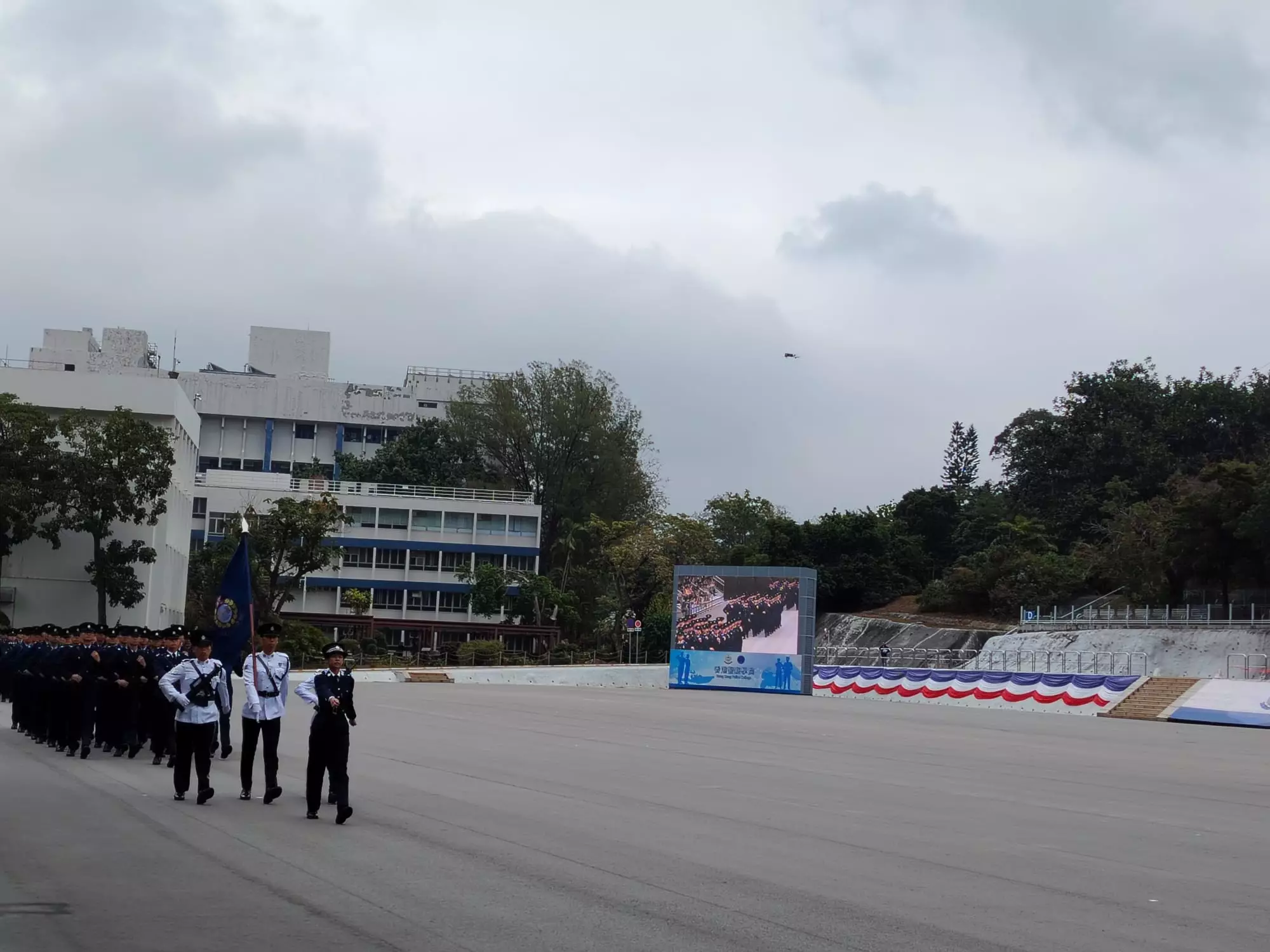 典禮中,護旗方隊是由 #警察學院學警及教官組成,穿着白色制服的護旗方隊,井然有序地步進操場,護送國旗和區旗到旗杆位置,進行升旗禮。
