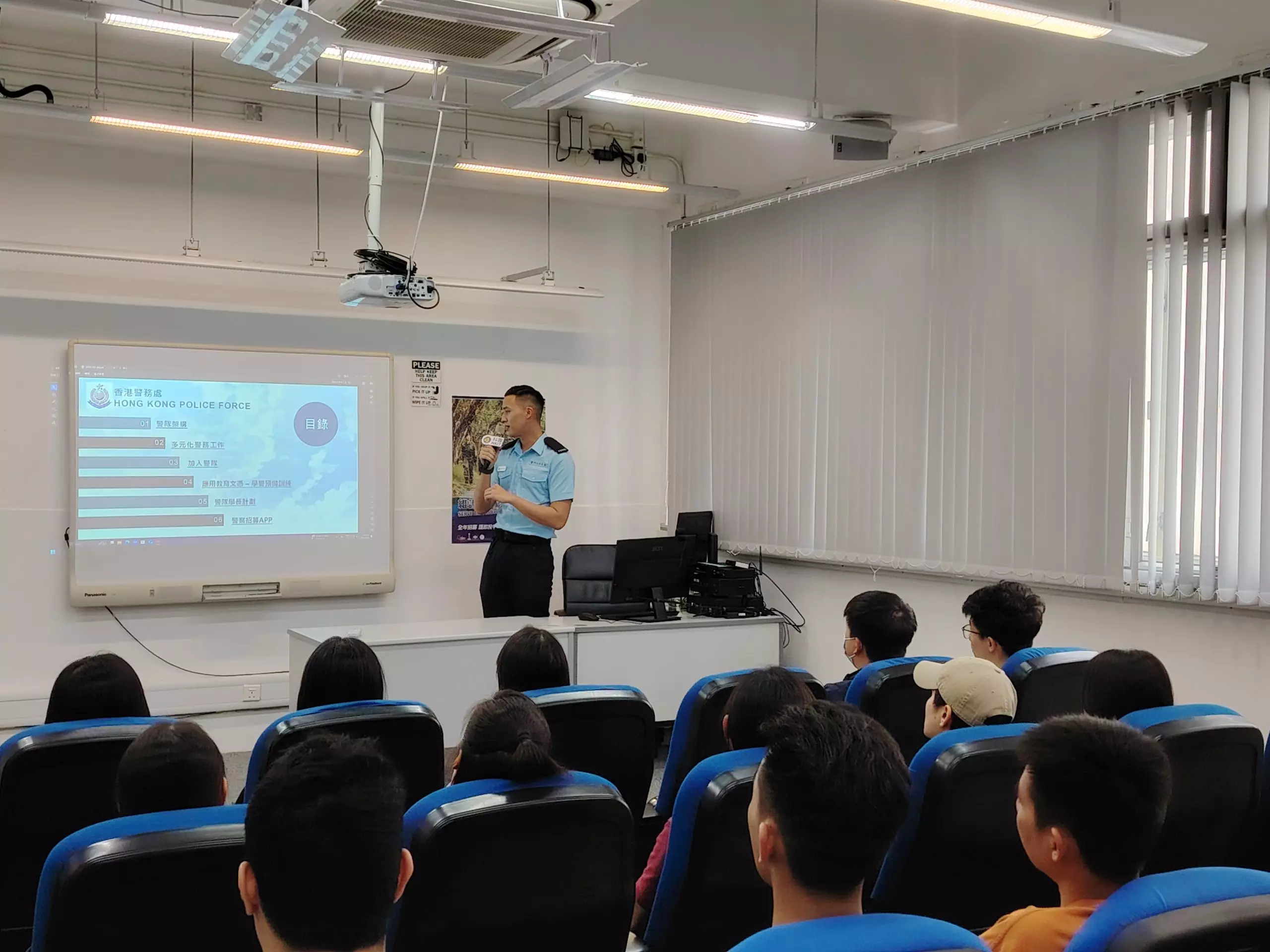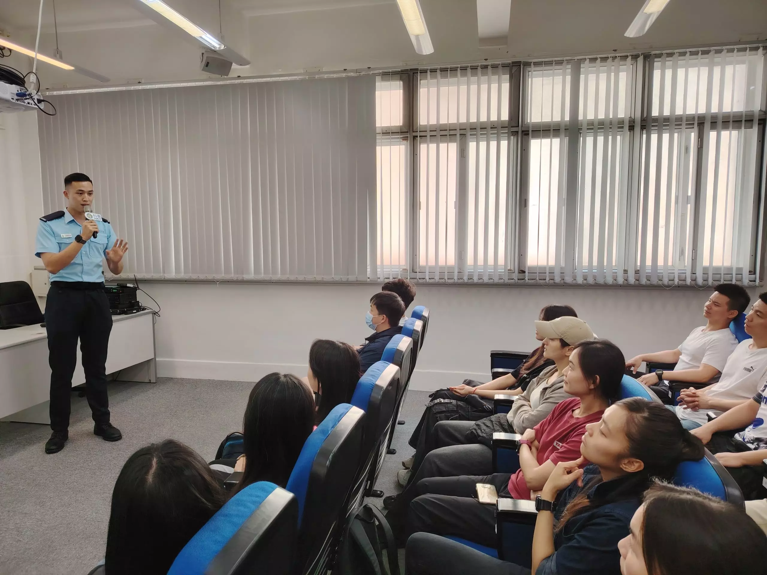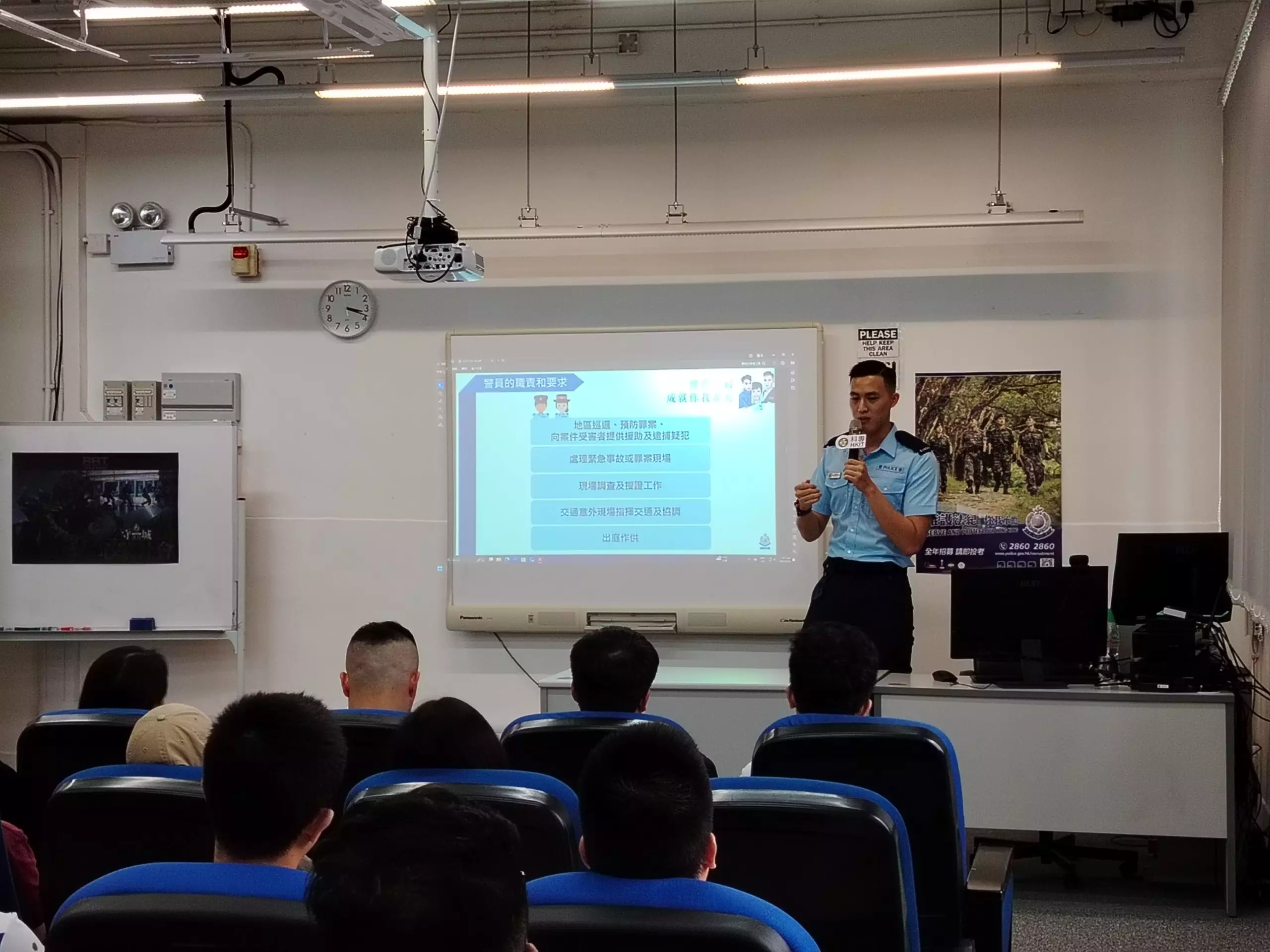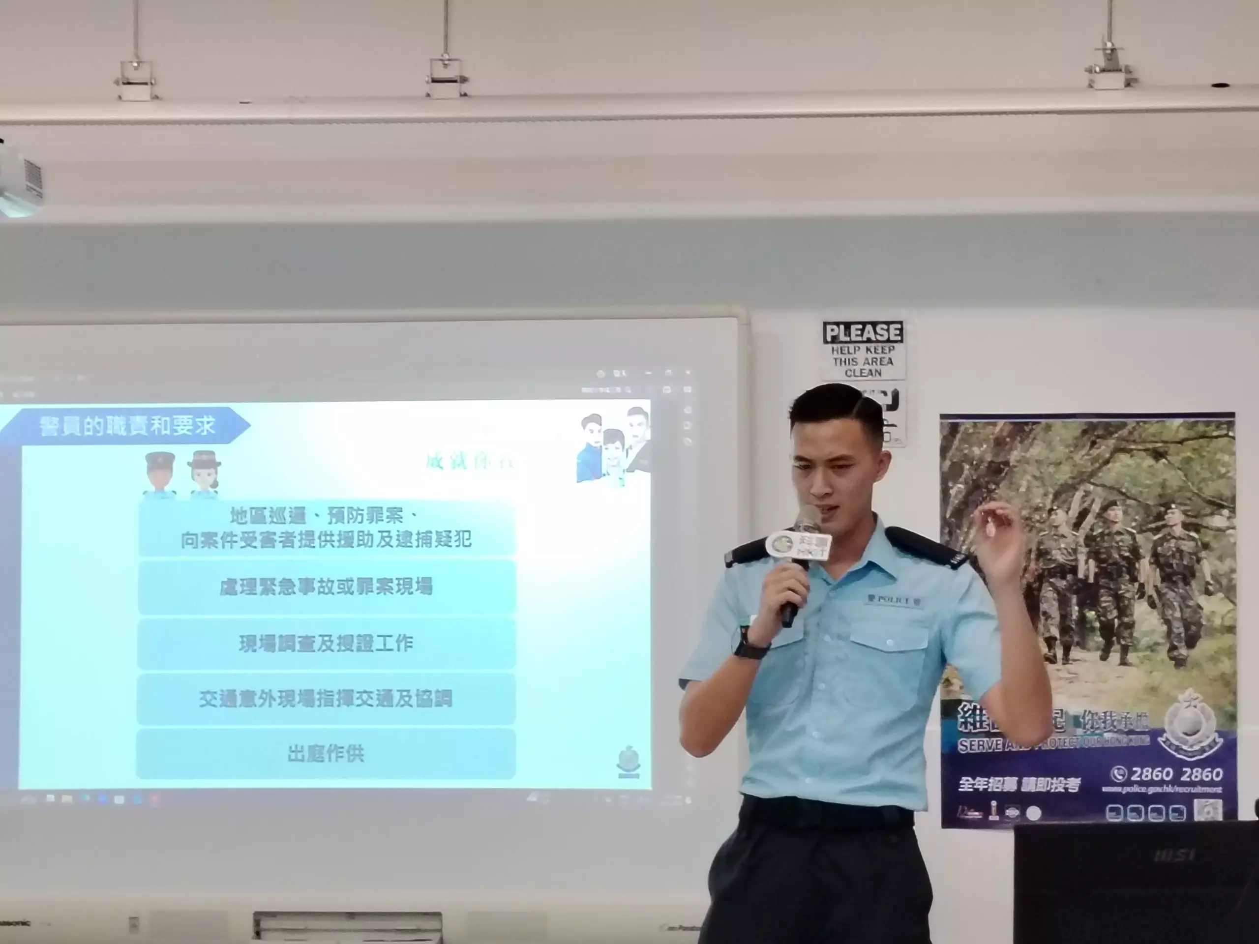 「亞賢」除咗分享咗由畢業到加入警隊嘅心路歷程,仲分享咗依家係紅磡分區軍裝巡邏小隊嘅工作點滴,佢嘅「#警察故事」令在場各同學深深感受到成為警察嘅使命感同責任。