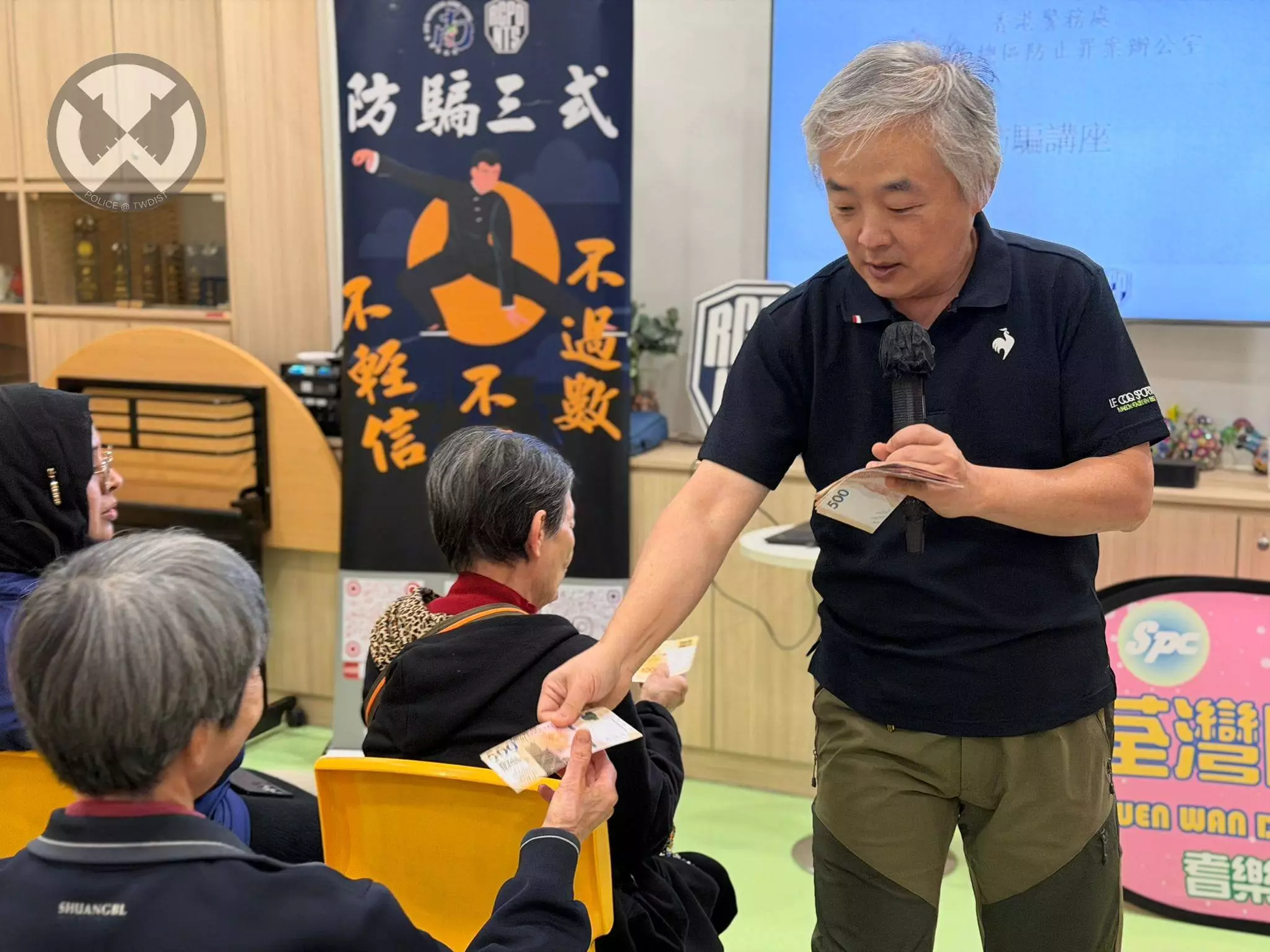 透過今次講座,除咗將最新嘅騙案手法及防罪知識介紹俾各位老友記,仲向老友記展示咗假銀紙,教大家點樣分辨真偽!另外,亦協助區內老友記下載「香港警察流動應用程式」,等大家加強防騙能力之餘,仲可以享用一站式電子服務平台,更方便又安心!,等老友記可以預防受騙之餘,亦將呢啲防騙訊息傳遞俾身邊嘅人。