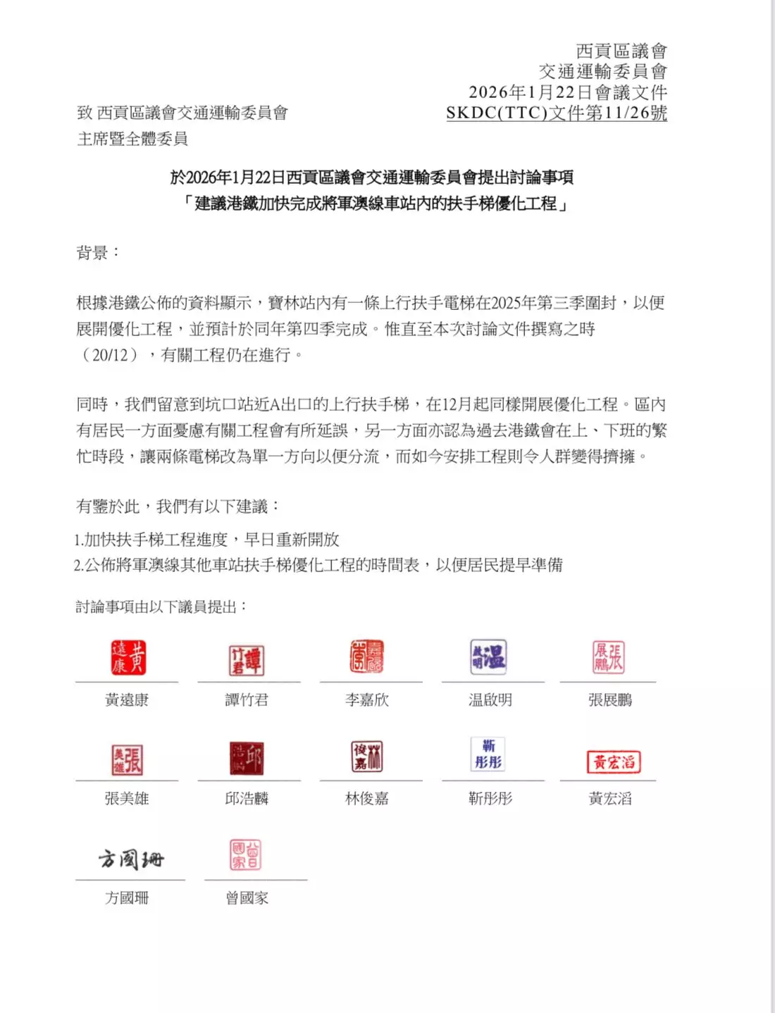 近日將軍澳線多個車站進行扶手梯更新工程,部分居民反映月台網絡訊號不穩。工聯會將軍澳團隊在早前區議會會議中已就相關情況提出關注,近日西貢區議員黃遠康再約見港鐵了解實際進度及後續安排。