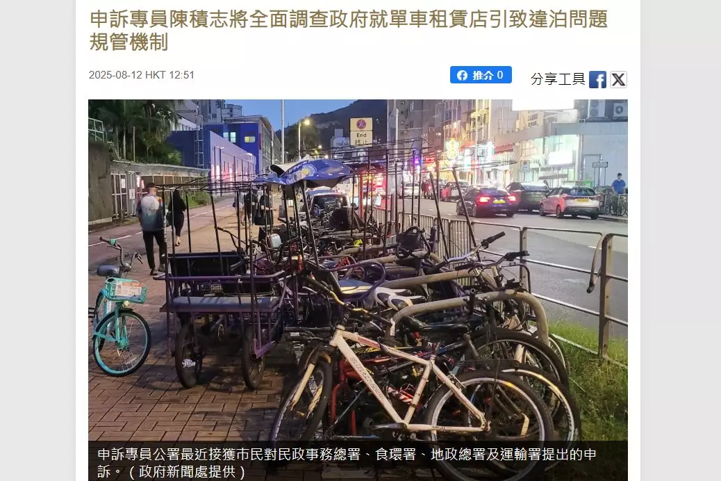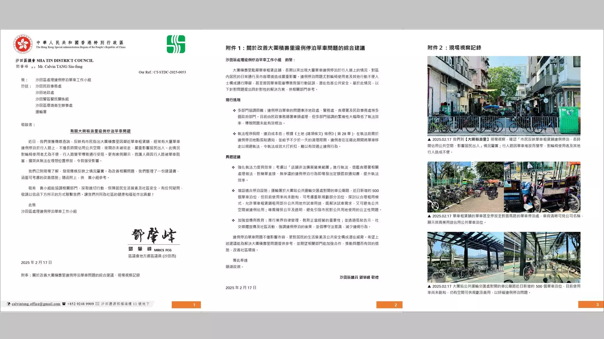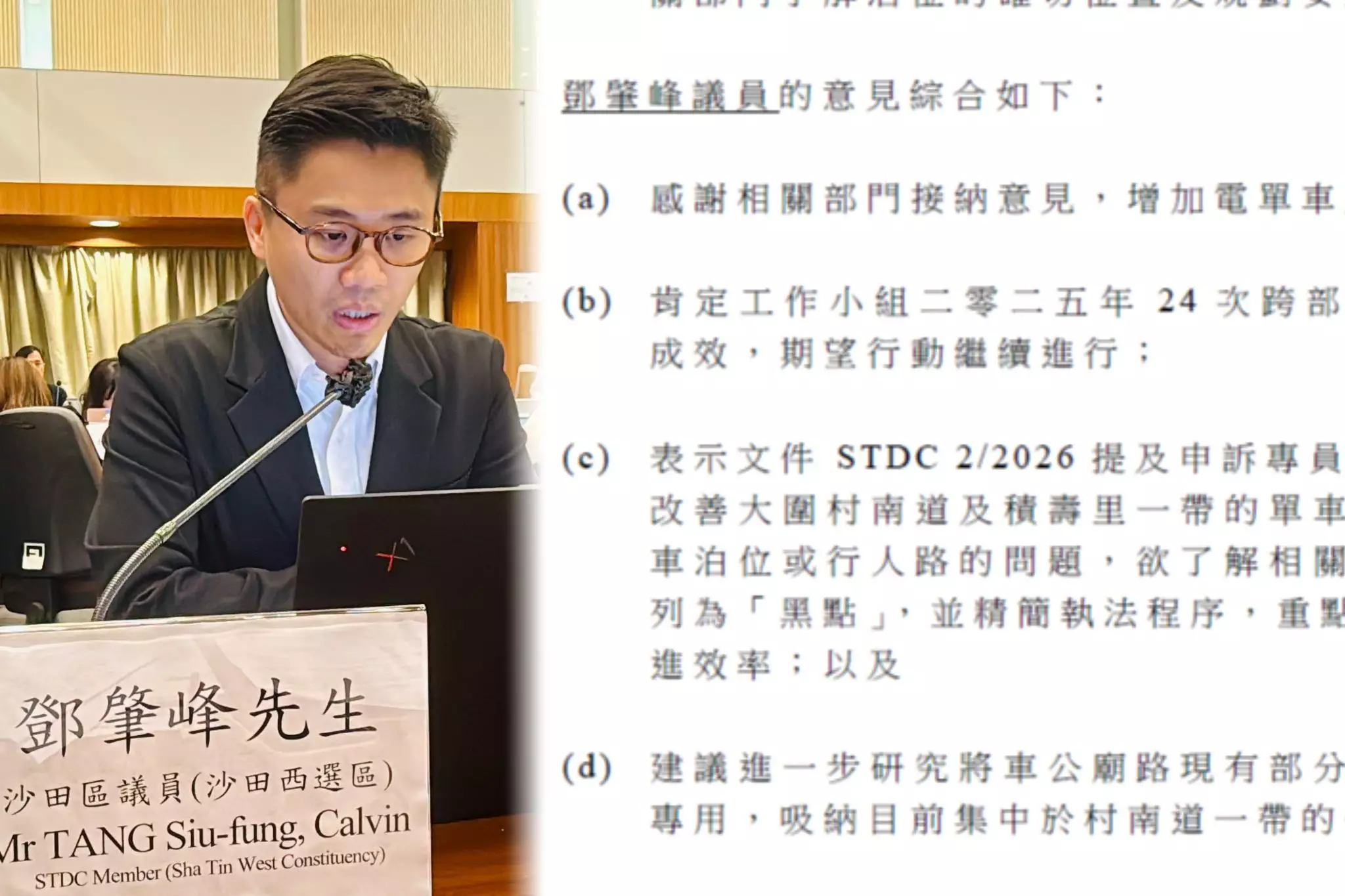 沙田區議員鄧肇峰於2026年3月19日在沙田區議會會議上,透過「單車工作小組」提交文件,跟進大圍區內的單車違泊問題,特別針對村南道及積壽里一帶的單車租賃店違例停泊情況,倡議以「堵疏結合」的方式,平衡執法與行業發展。