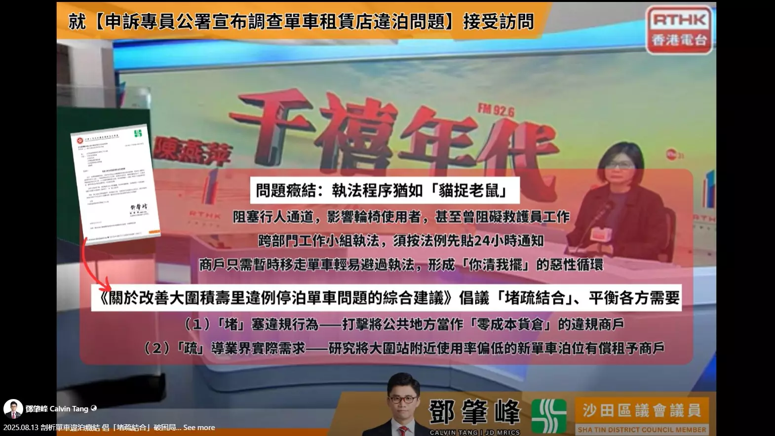 鄧議員指出,自2025年初提出《改善大圍積壽里違例停泊單車問題的綜合建議》後,他一直持續跟進情況。他批評過去的執法程序因須預先張貼通知導致成效有限,部分違規商戶可提前移走單車以避過處分,令問題屢見不鮮。對於政府現已採納意見,調整聯合行動模式並加強執法,他予以肯定。